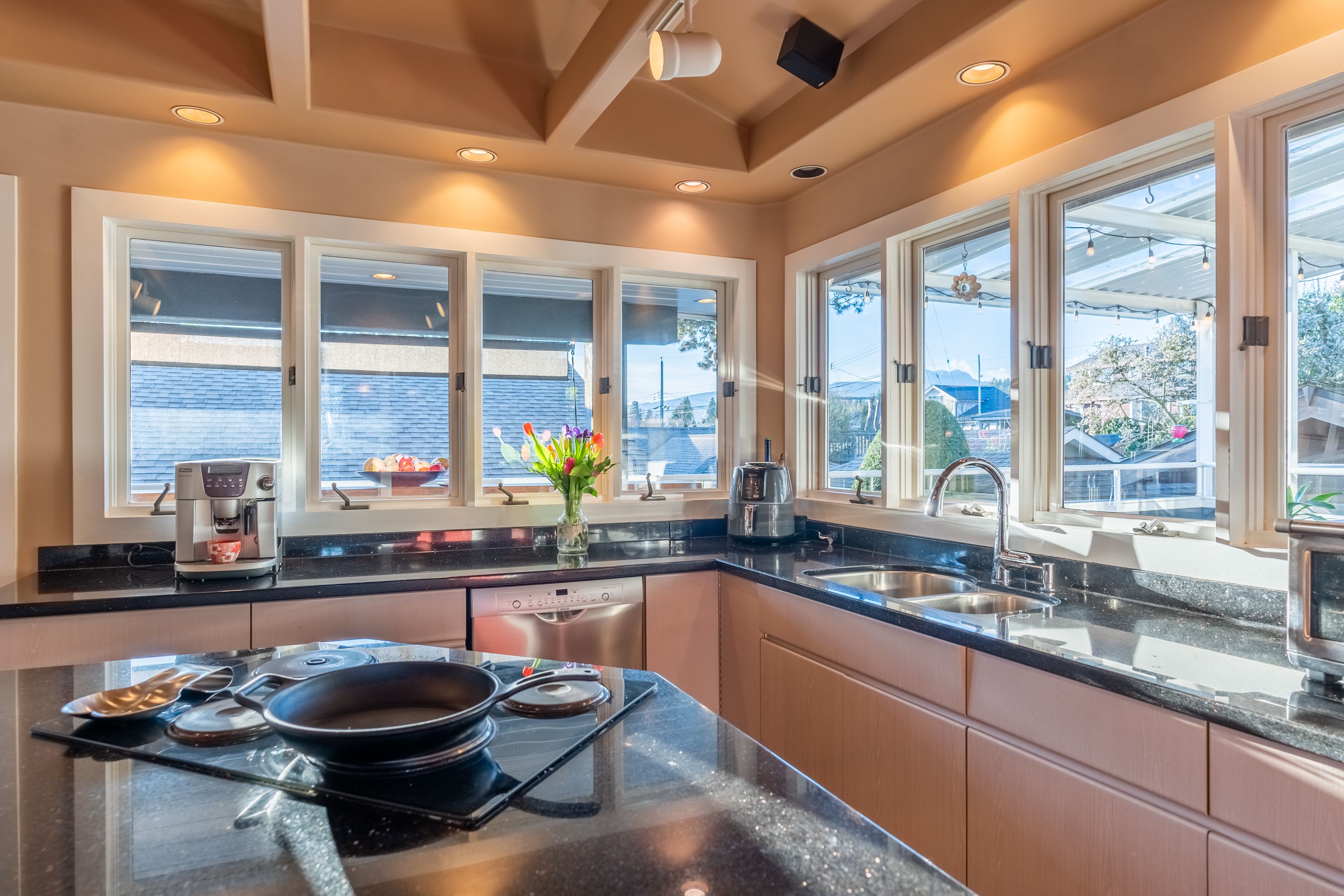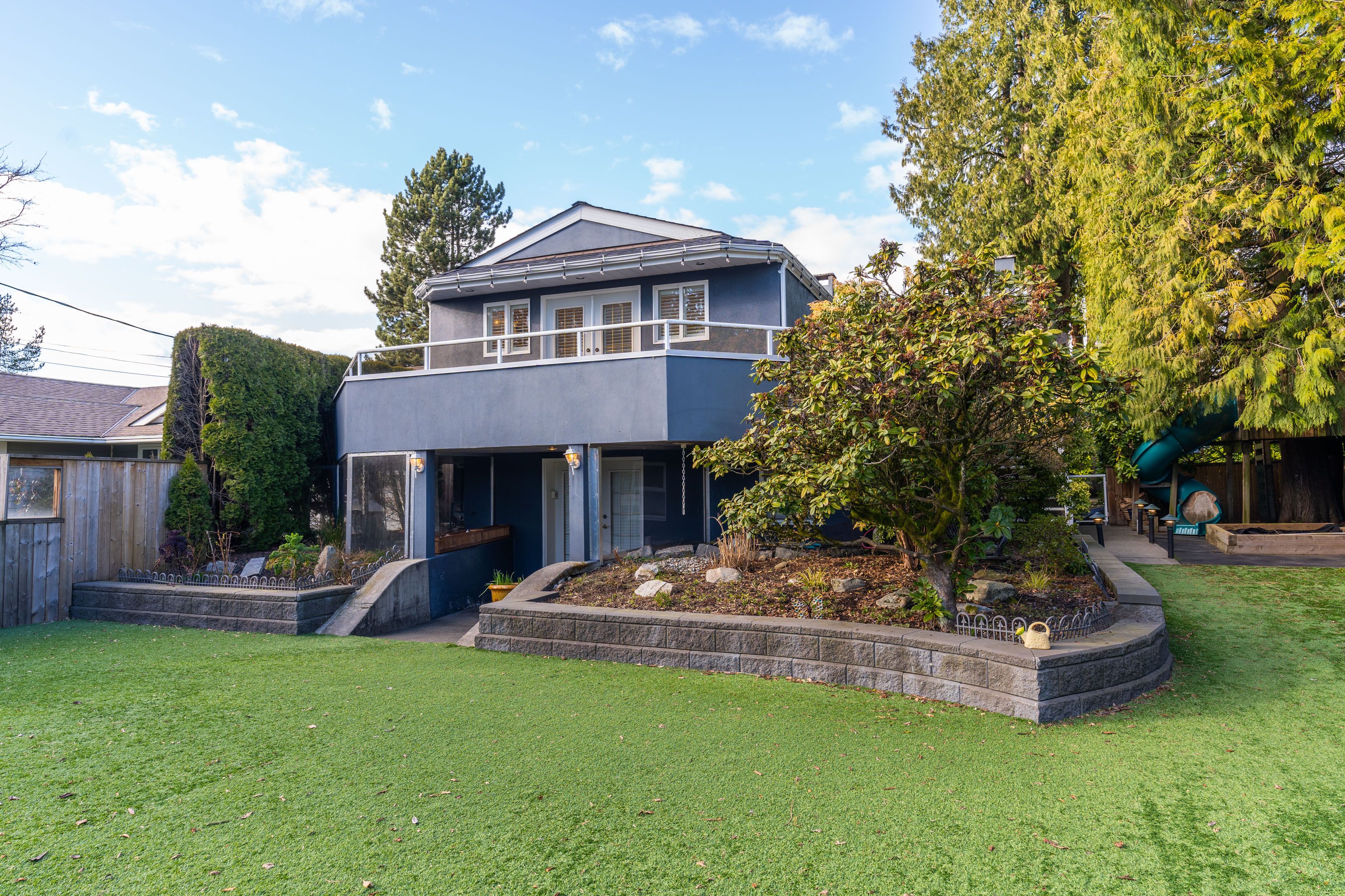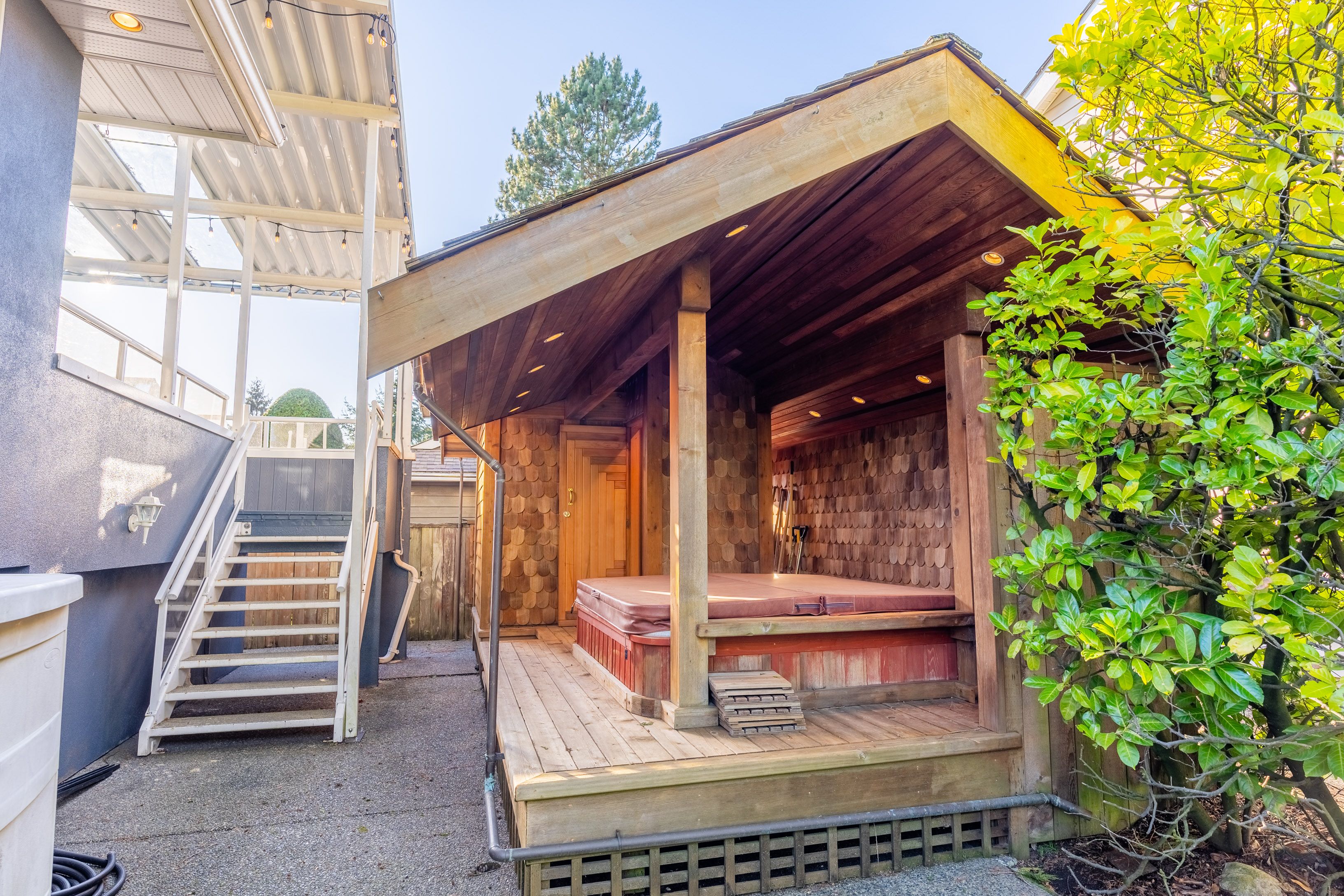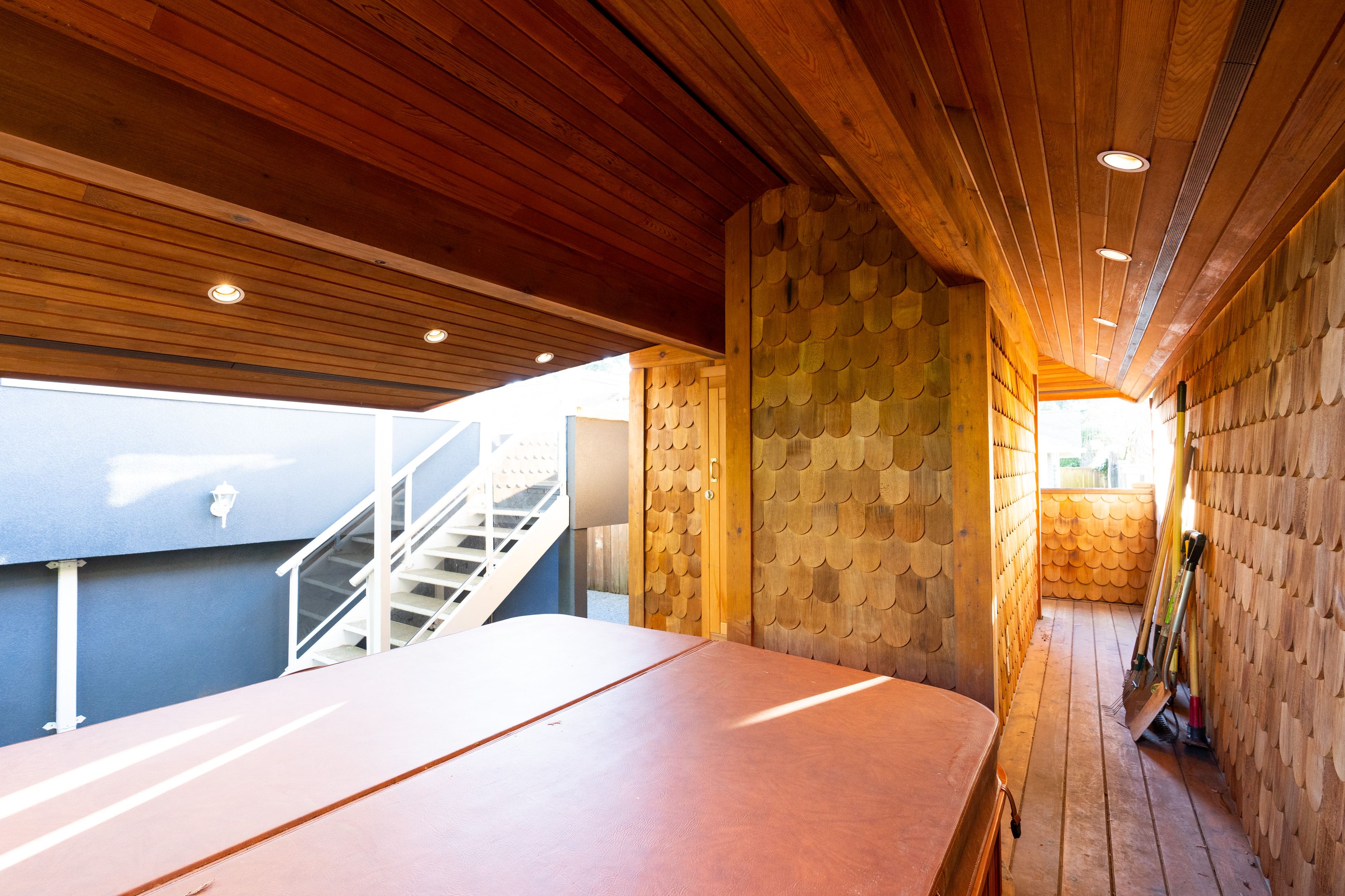 Bright & spacious 2 level, 3,113 sqft, 4 bedroom Boulevard family home on a 7,500 sqft lot featuring NEWER ADDITIONS/RENOVATIONS in & out! Upper floor highlighted with gourmet kitchen boasting stainless steel appliances and granite cooktop Island. Large living/dining areas shocase vaulted ceilings with hemlock beams. Incredible 5pc bathroom reno. Massive covered entertainment sized patio complimented with a built in river rock BBQ. Masterbed room has a private wrap around deck. Main level contains flex 1 or 2 bedroom suite, rec room & wine cellar. Custom detached sauna & hot tub gazebo. Garage and lots of storage.*NEWER; Modern/sunken lights, built-in stereo, hardwood, fans, exterior paint, masonry walls with illumination, quality artificial turf, side driveway/extra parking. Suitable for family daycare. Quiet street; walk to shopping & schools and the Lonsdale corridor.