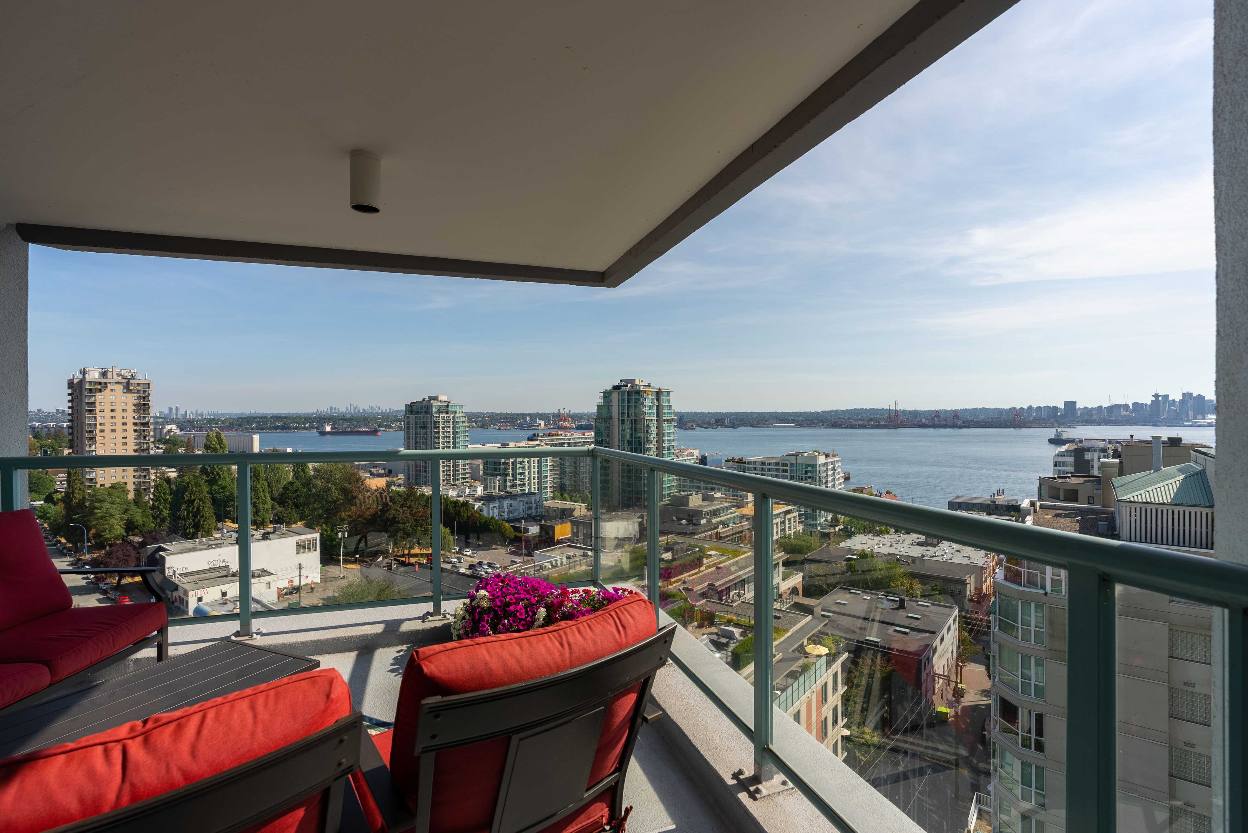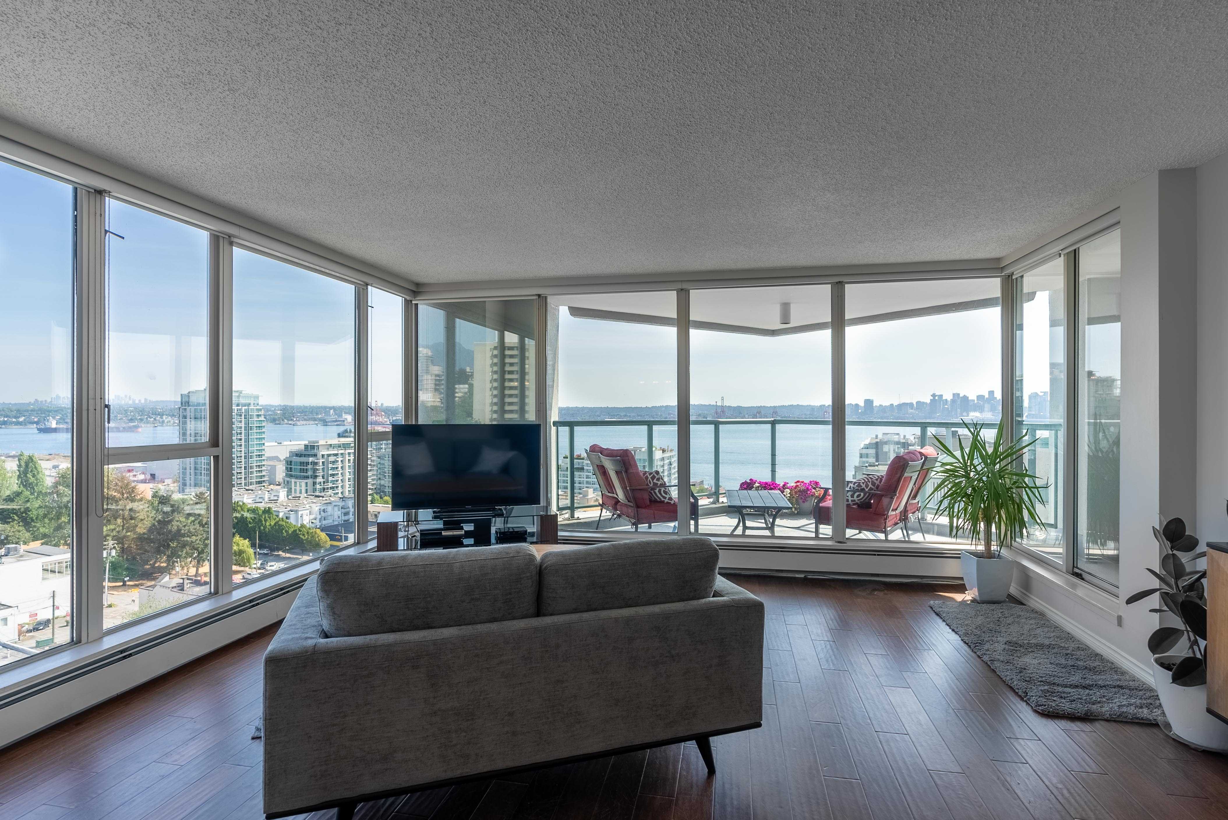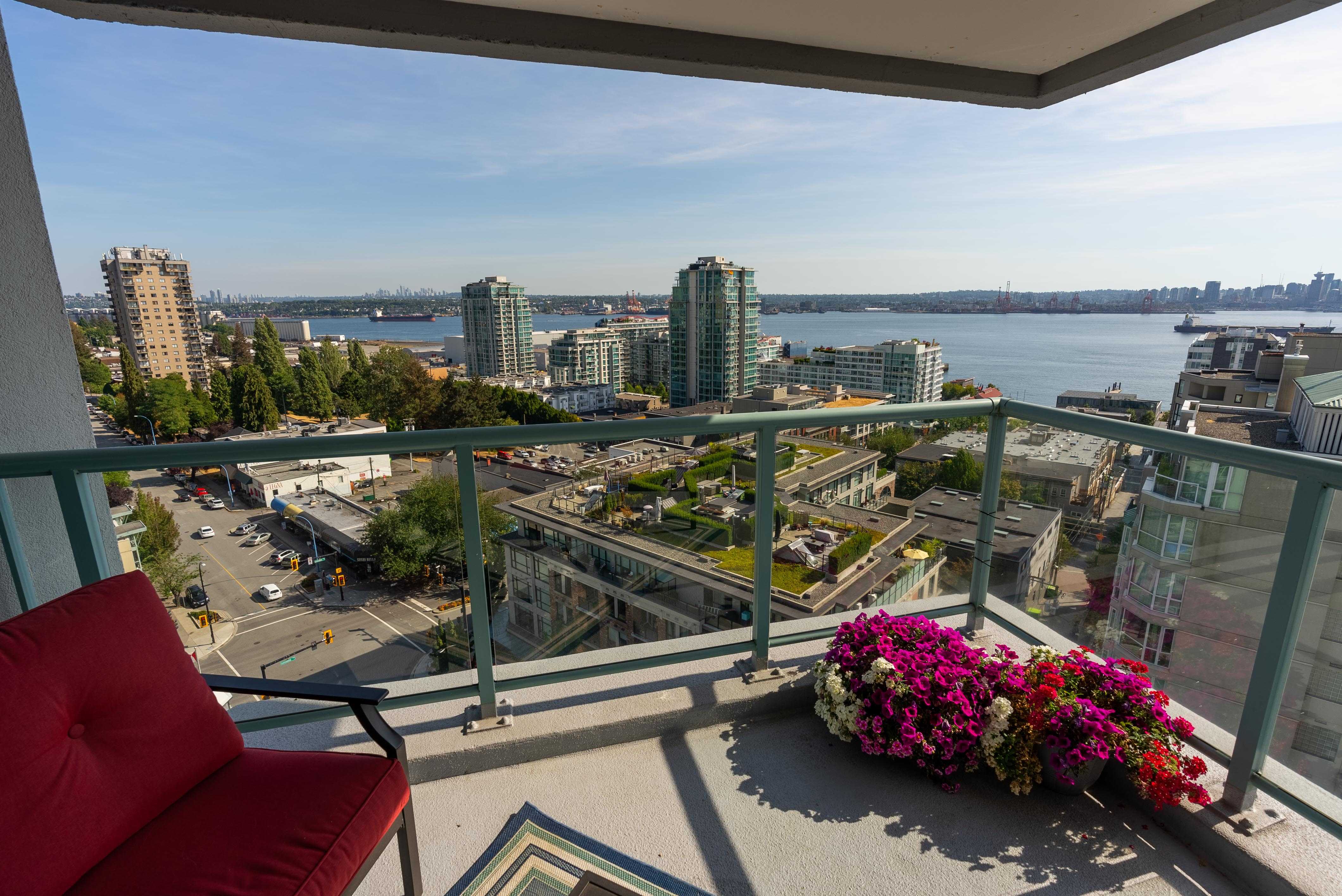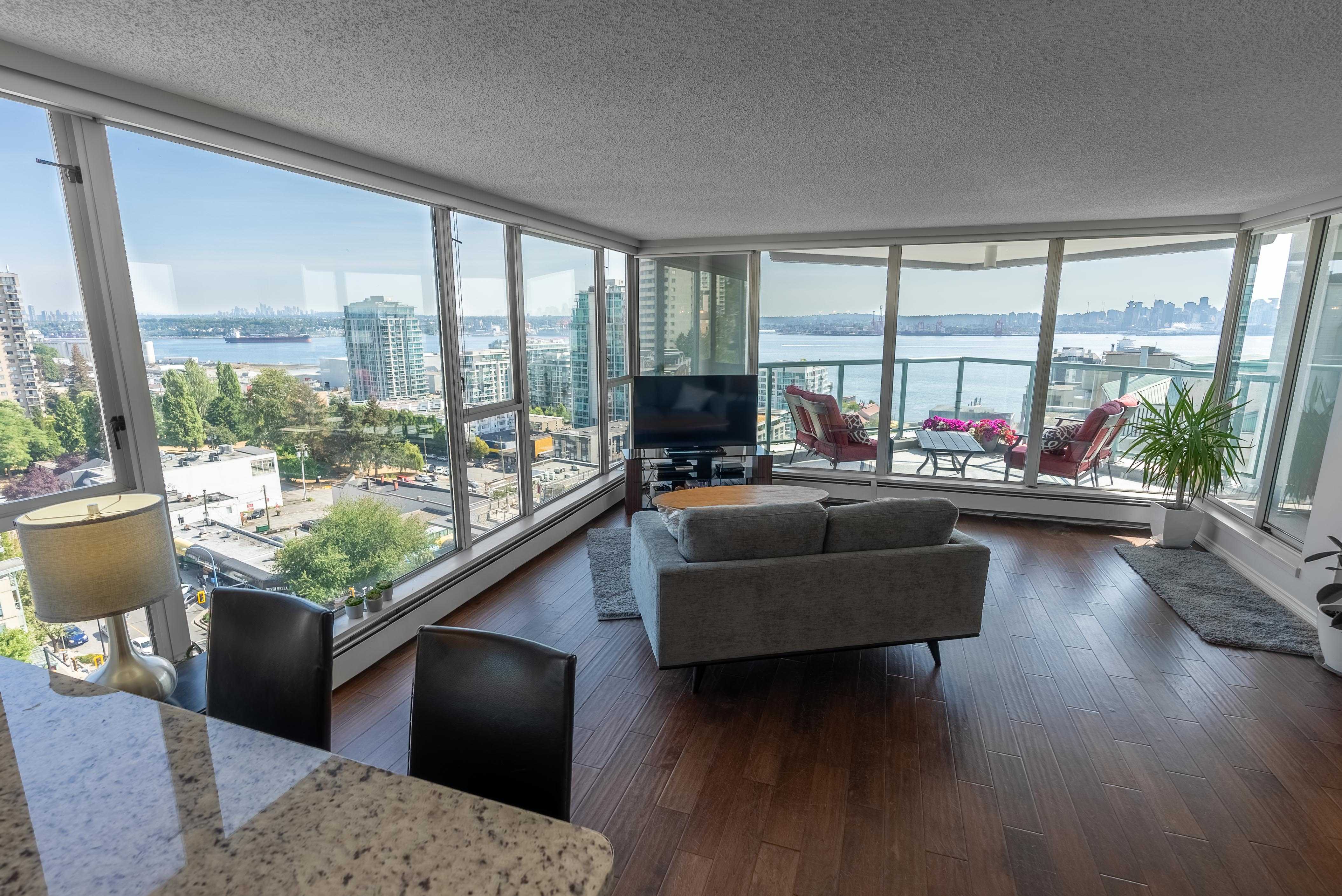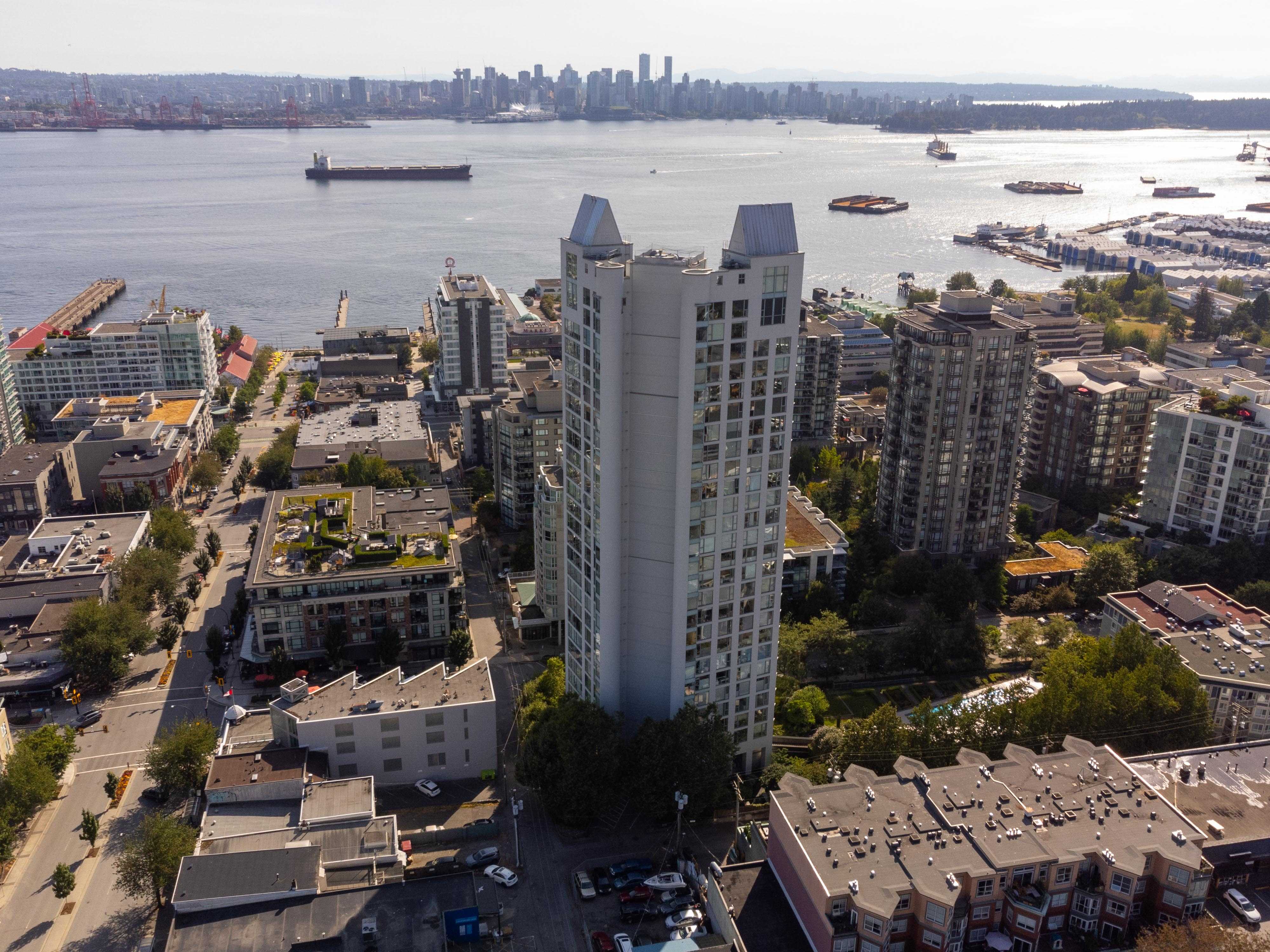 Unobstructed panoramic city & water views from way up on high! The 15th floor sees over local buildings! Views of Van City skyline, Burrard Inlet, Lions Gate Bridge, Mt. Baker, Metrotown/Burnaby Skyline and the North Shore Mountains. Sleek tiled entry, floor to ceiling windows and mesh/blackout blinds compliment the modern/renovated open concept floor plan. Updated kitchen boasts stainless steel appliances, granite tops. Both bathrooms updated with marble or granite themes. Solid dark flooring throughout. Bedrooms on opposite sides of home for privacy. Great closet space. Insuite laundry/built in vac. Plenty of storage.*Enjoy the outdoor pool, exercise centre. 2 underground parking spots. 1 storage locker. Walk to the Seabus. Absolute prime LOLO location; restaurants, cafes, shopping, Lonsdale Quay!