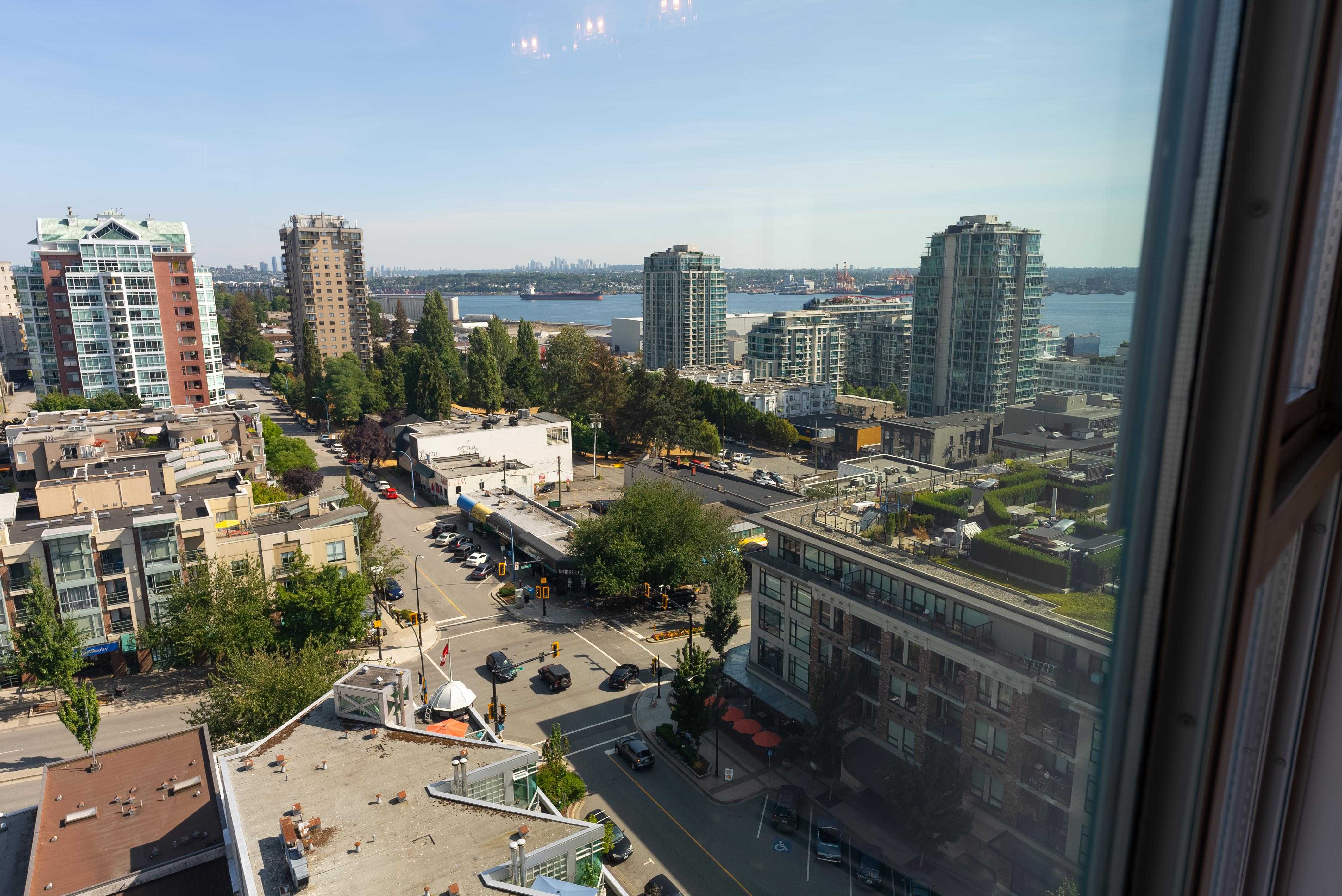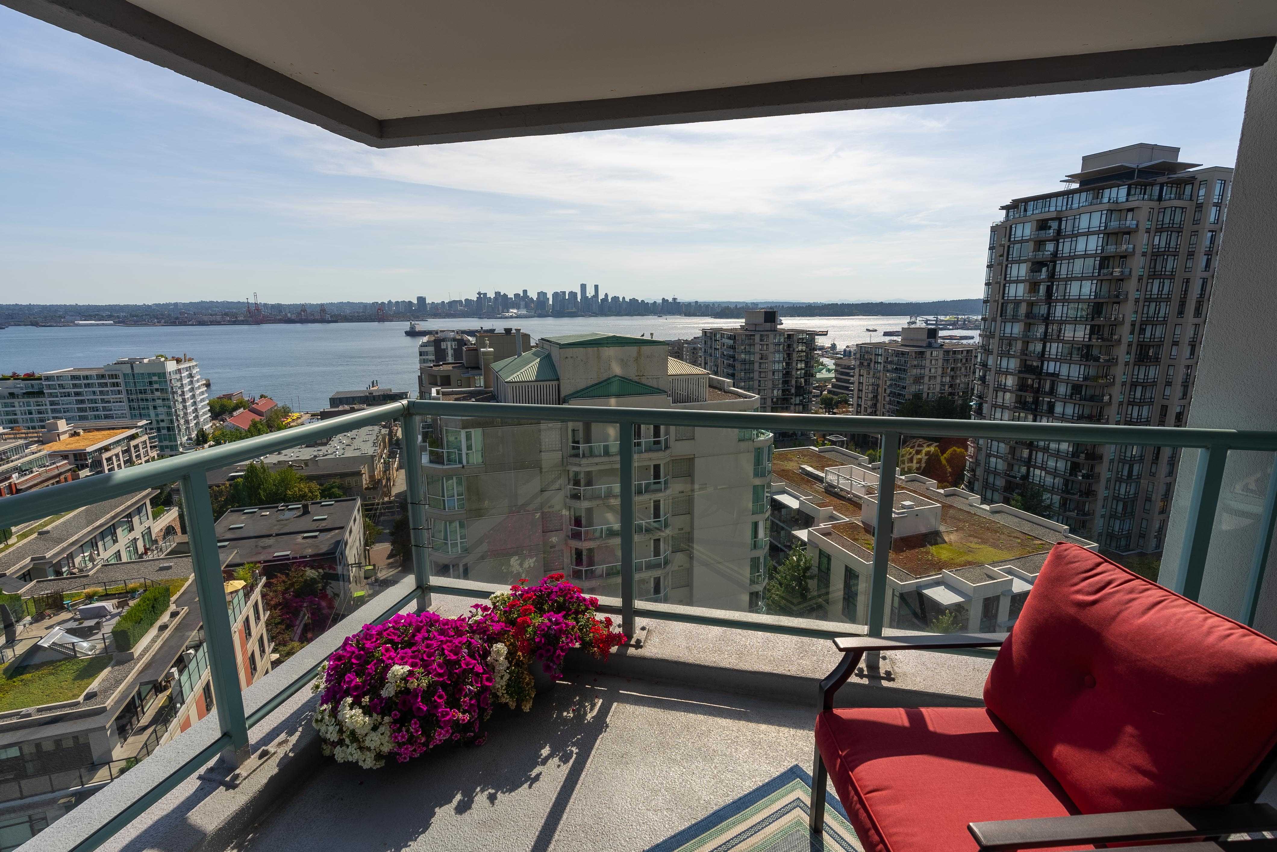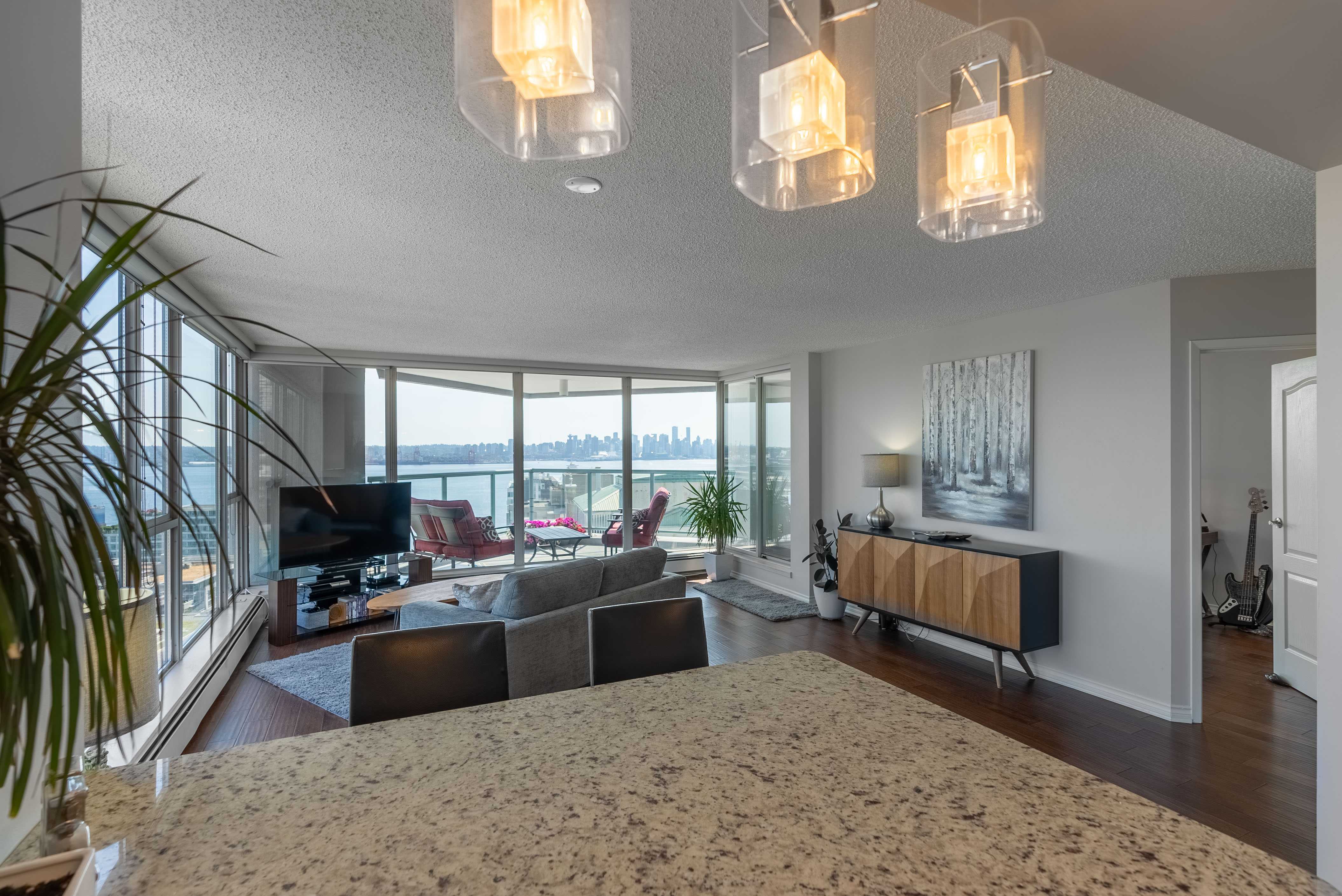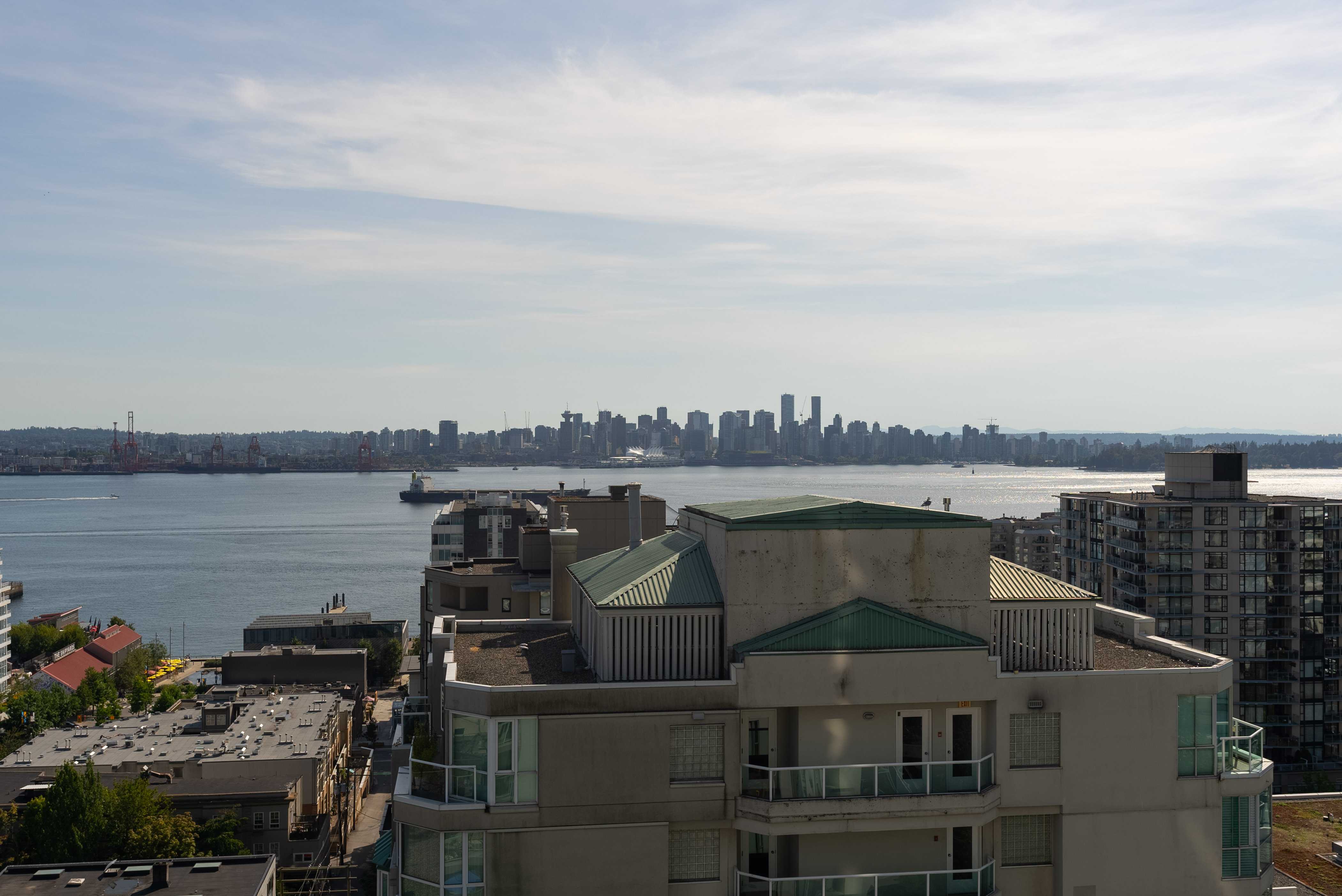 Unobstructed panoramic city & water views from way up on high! The 15th floor sees over local buildings! Views of Van City skyline, Burrard Inlet, Lions Gate Bridge, Mt. Baker, Metrotown/Burnaby Skyline and the North Shore Mountains. Sleek tiled entry, floor to ceiling windows and mesh/blackout blinds compliment the modern/renovated open concept floor plan. Updated kitchen boasts stainless steel appliances, granite tops. Both bathrooms updated with marble or granite themes. Solid dark flooring throughout. Bedrooms on opposite sides of home for privacy. Great closet space. Insuite laundry/built in vac. Plenty of storage.*Enjoy the outdoor pool, exercise centre. 2 underground parking spots. 1 storage locker. Walk to the Seabus. Absolute prime LOLO location; restaurants, cafes, shopping, Lonsdale Quay!