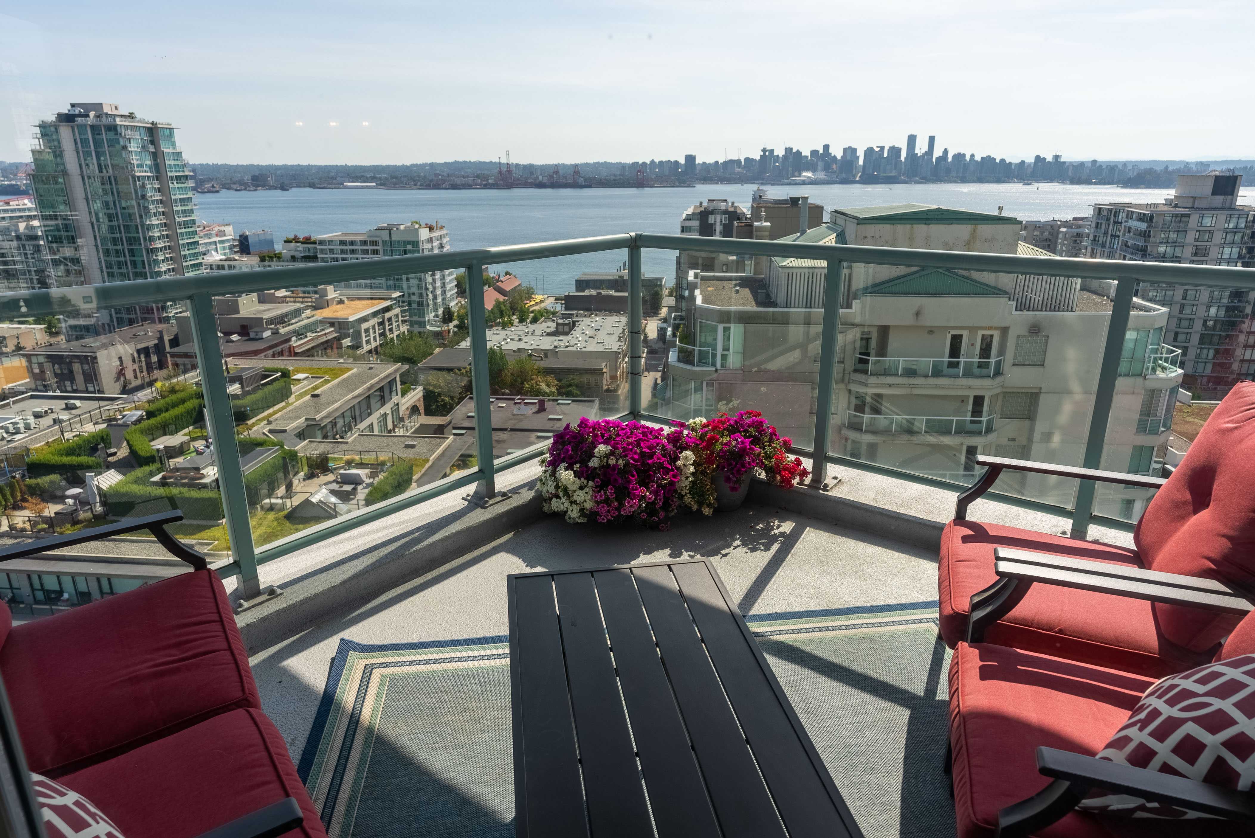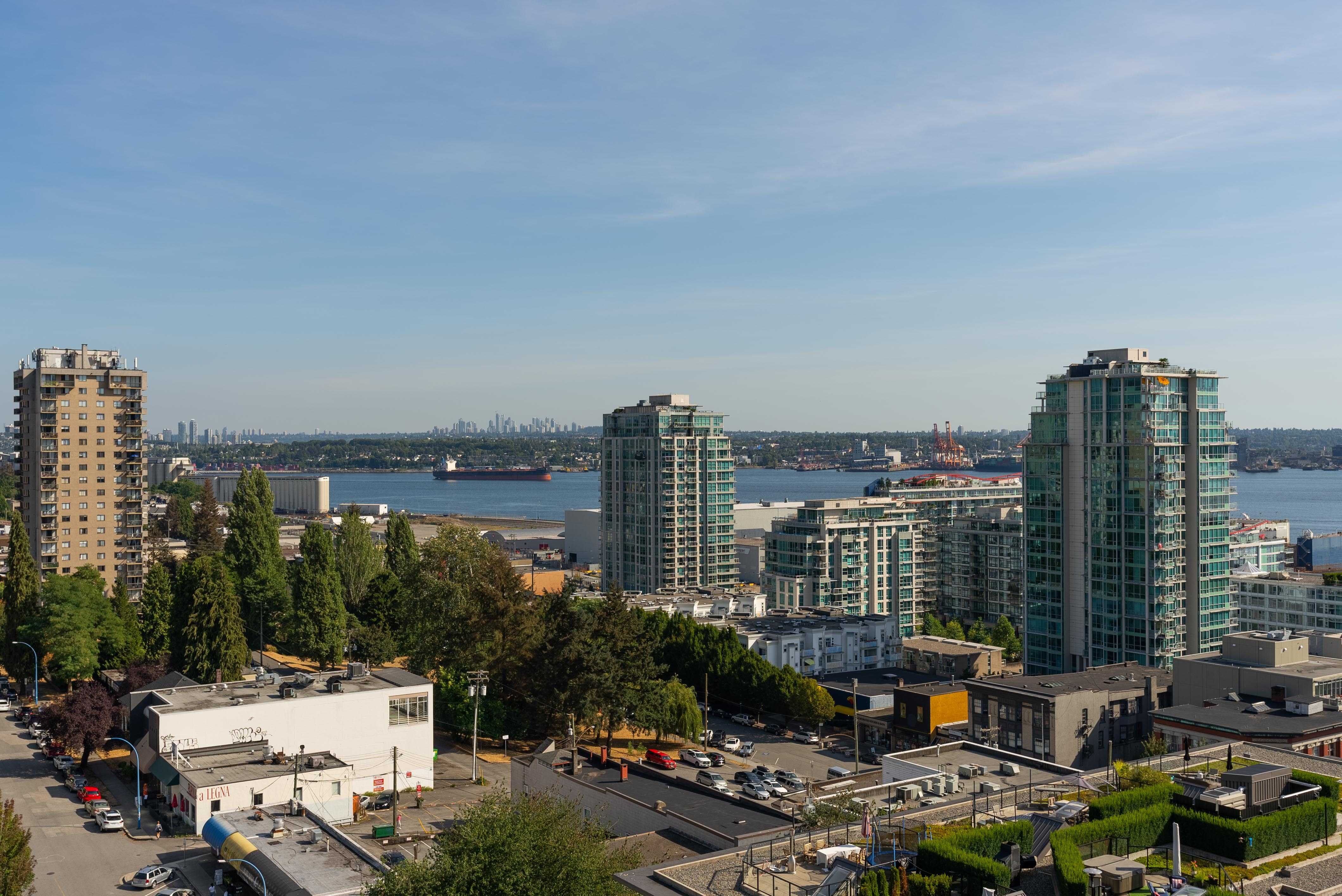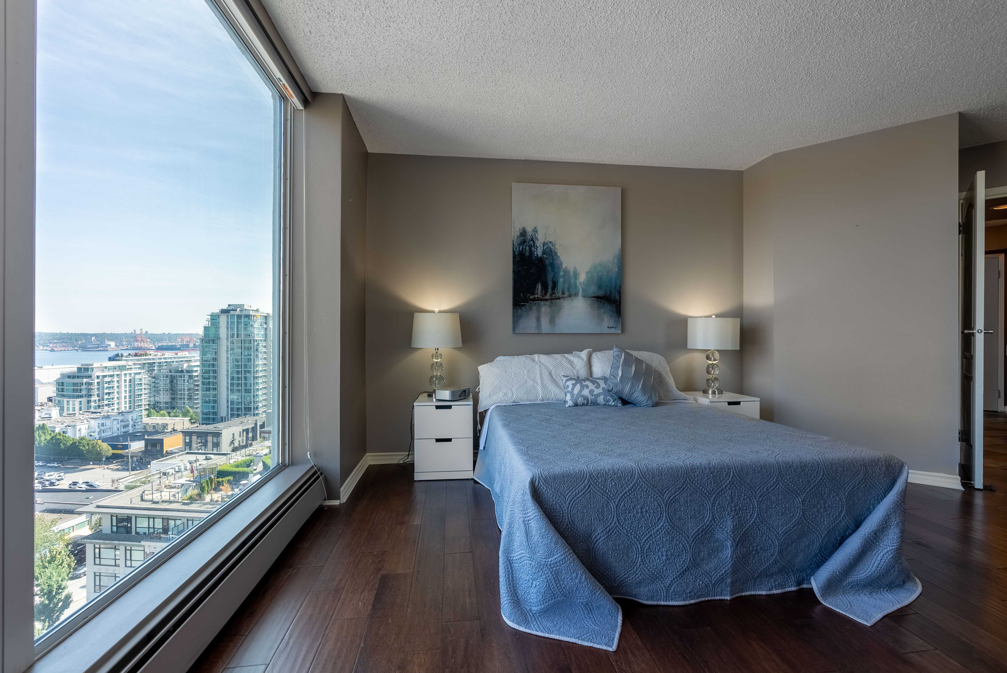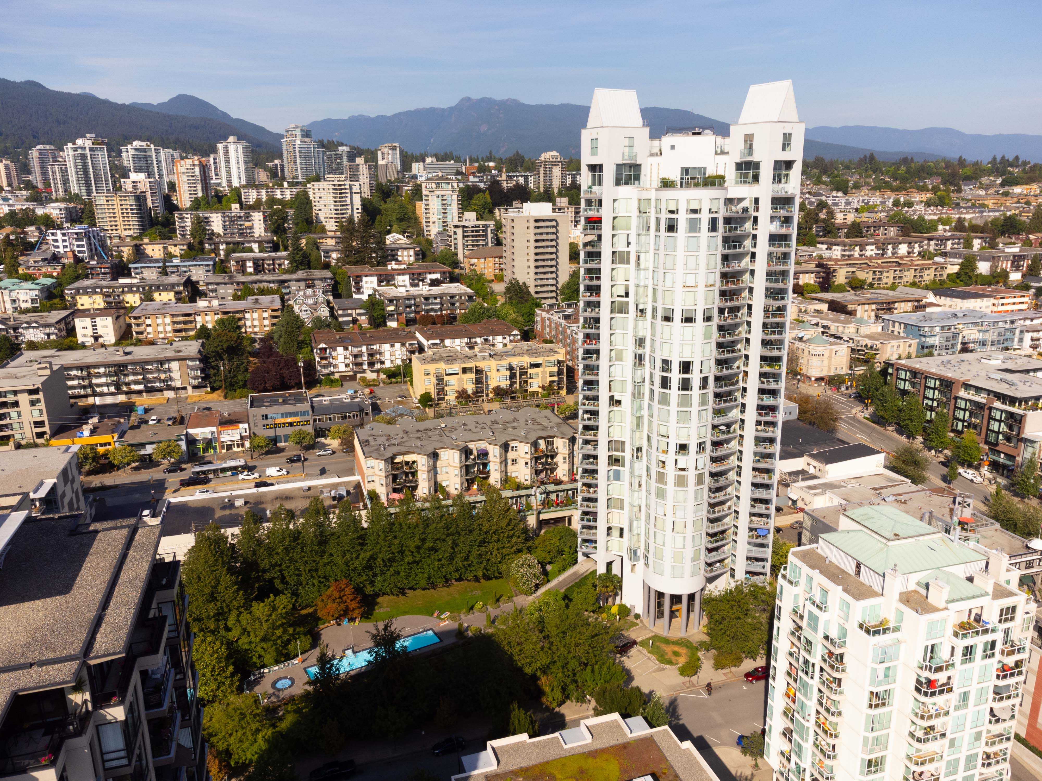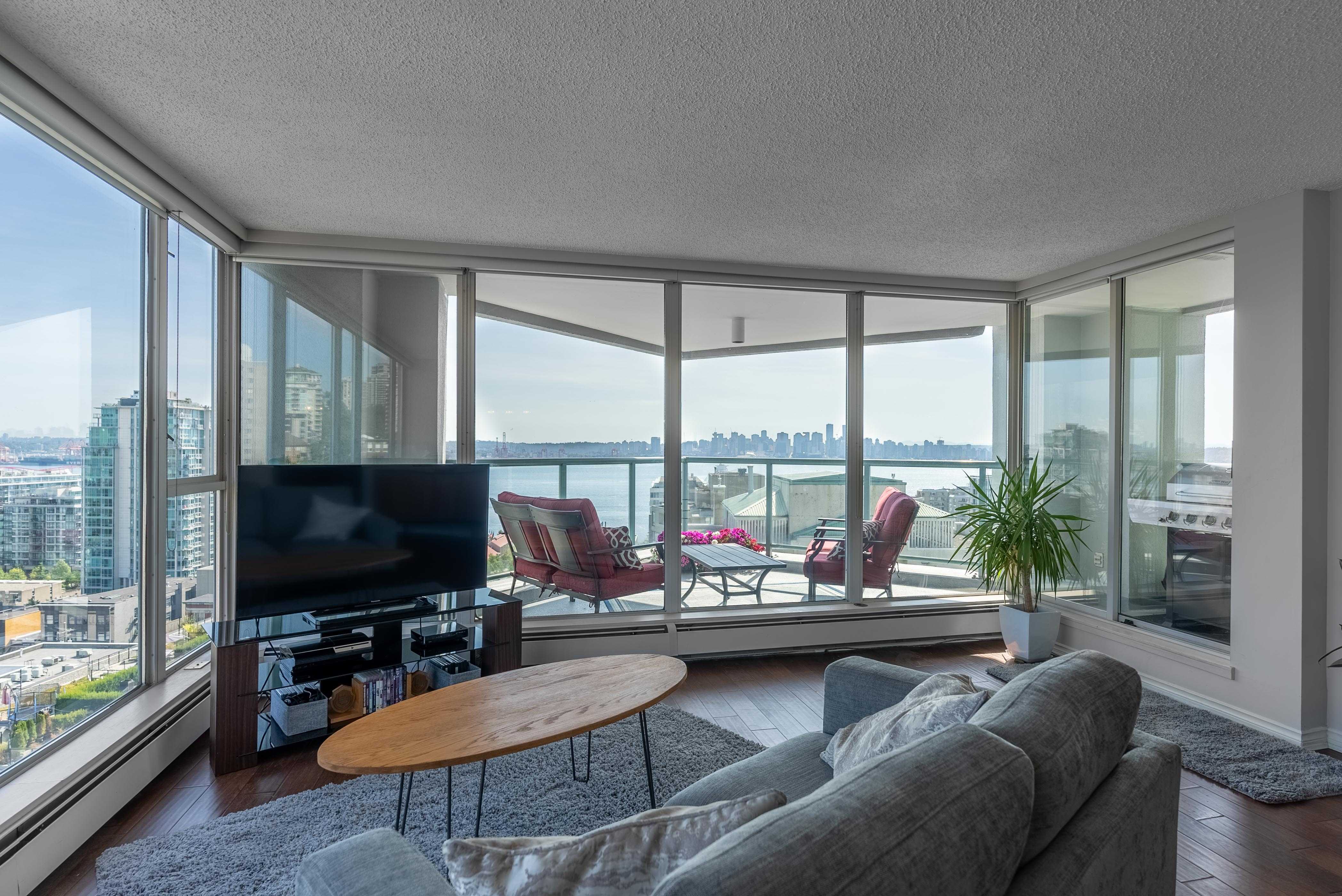 Unobstructed panoramic city & water views from way up on high! The 15th floor sees over local buildings! Views of Van City skyline, Burrard Inlet, Lions Gate Bridge, Mt. Baker, Metrotown/Burnaby Skyline and the North Shore Mountains. Sleek tiled entry, floor to ceiling windows and mesh/blackout blinds compliment the modern/renovated open concept floor plan. Updated kitchen boasts stainless steel appliances, granite tops. Both bathrooms updated with marble or granite themes. Solid dark flooring throughout. Bedrooms on opposite sides of home for privacy. Great closet space. Insuite laundry/built in vac. Plenty of storage.*Enjoy the outdoor pool, exercise centre. 2 underground parking spots. 1 storage locker. Walk to the Seabus. Absolute prime LOLO location; restaurants, cafes, shopping, Lonsdale Quay!