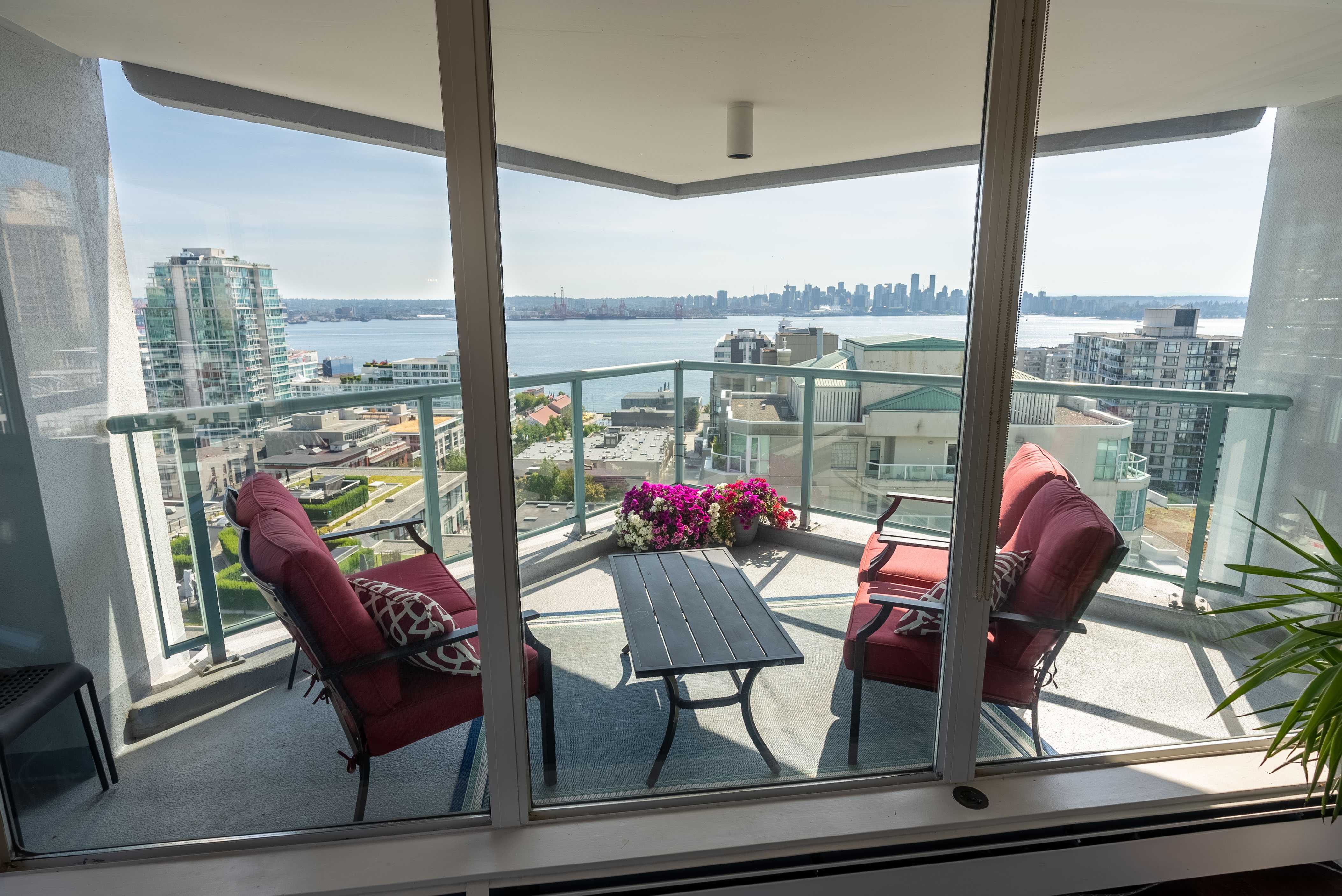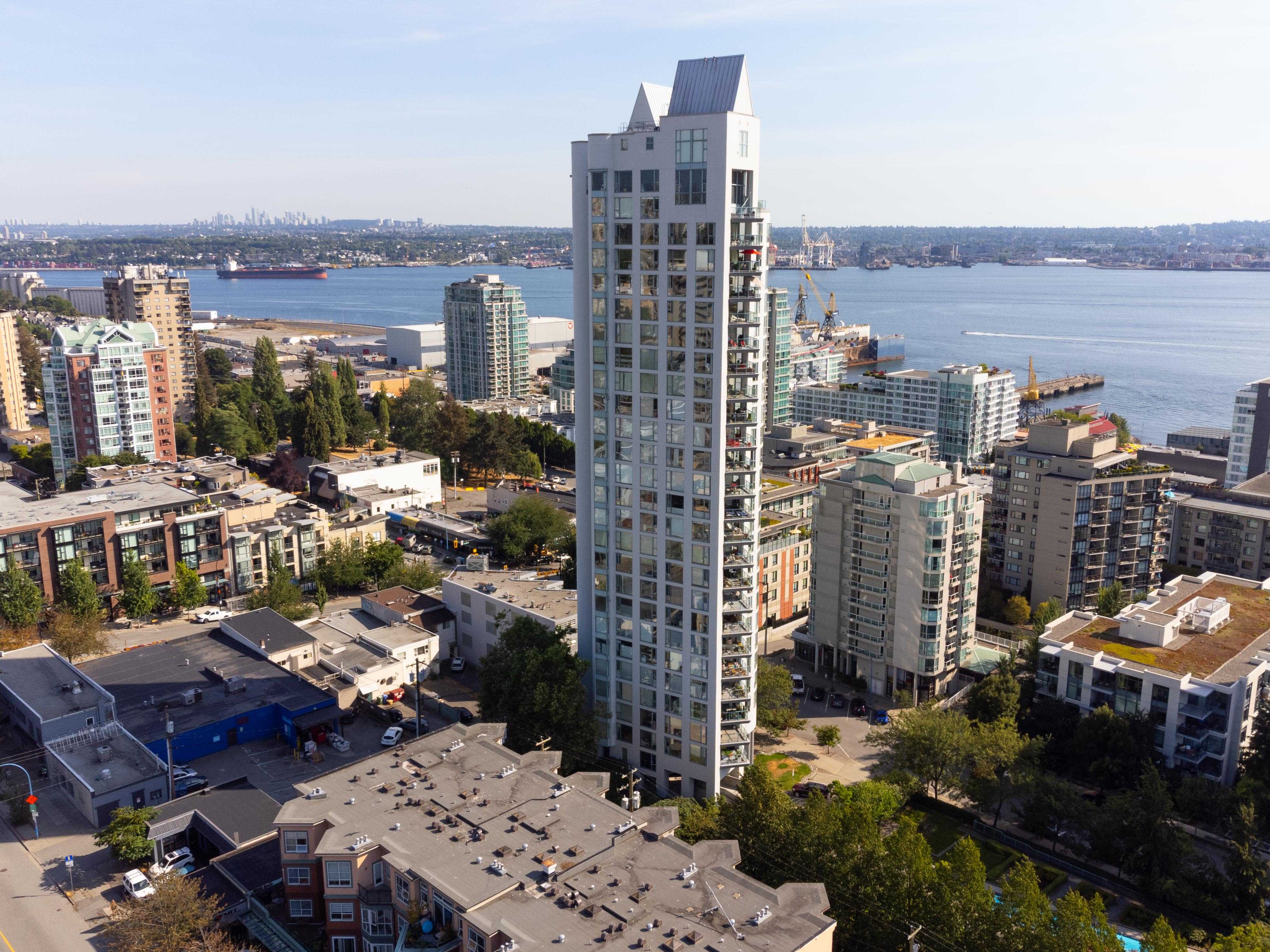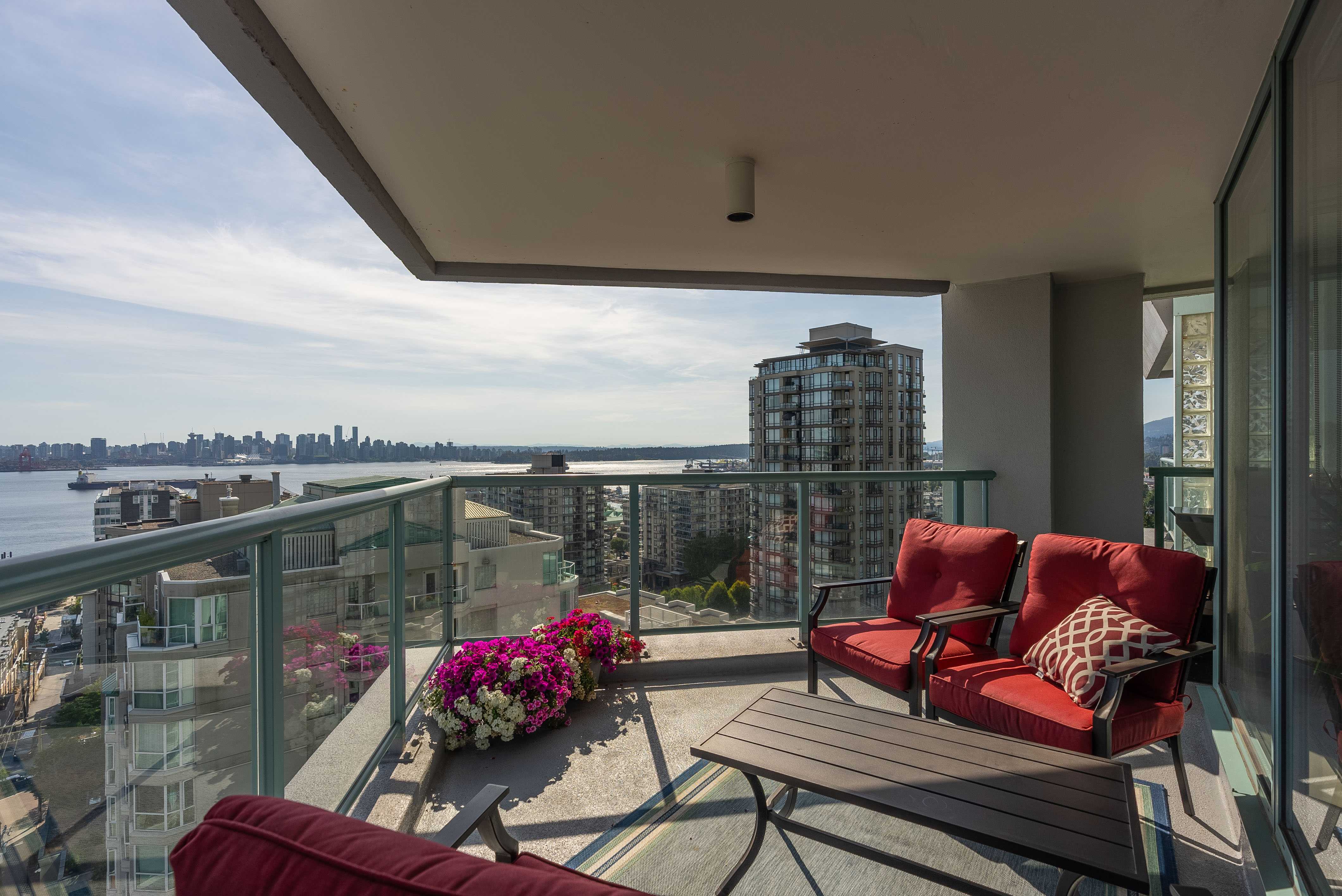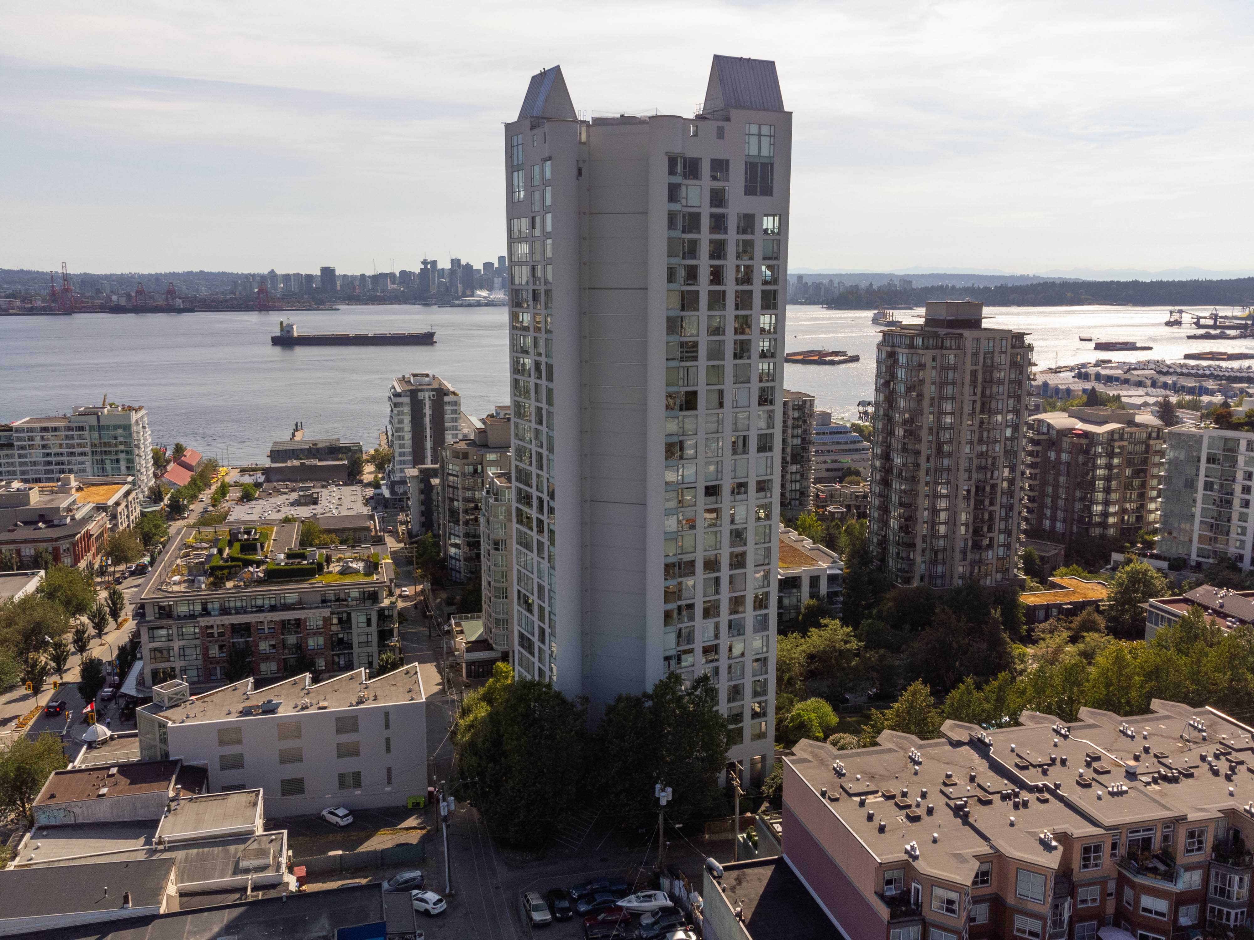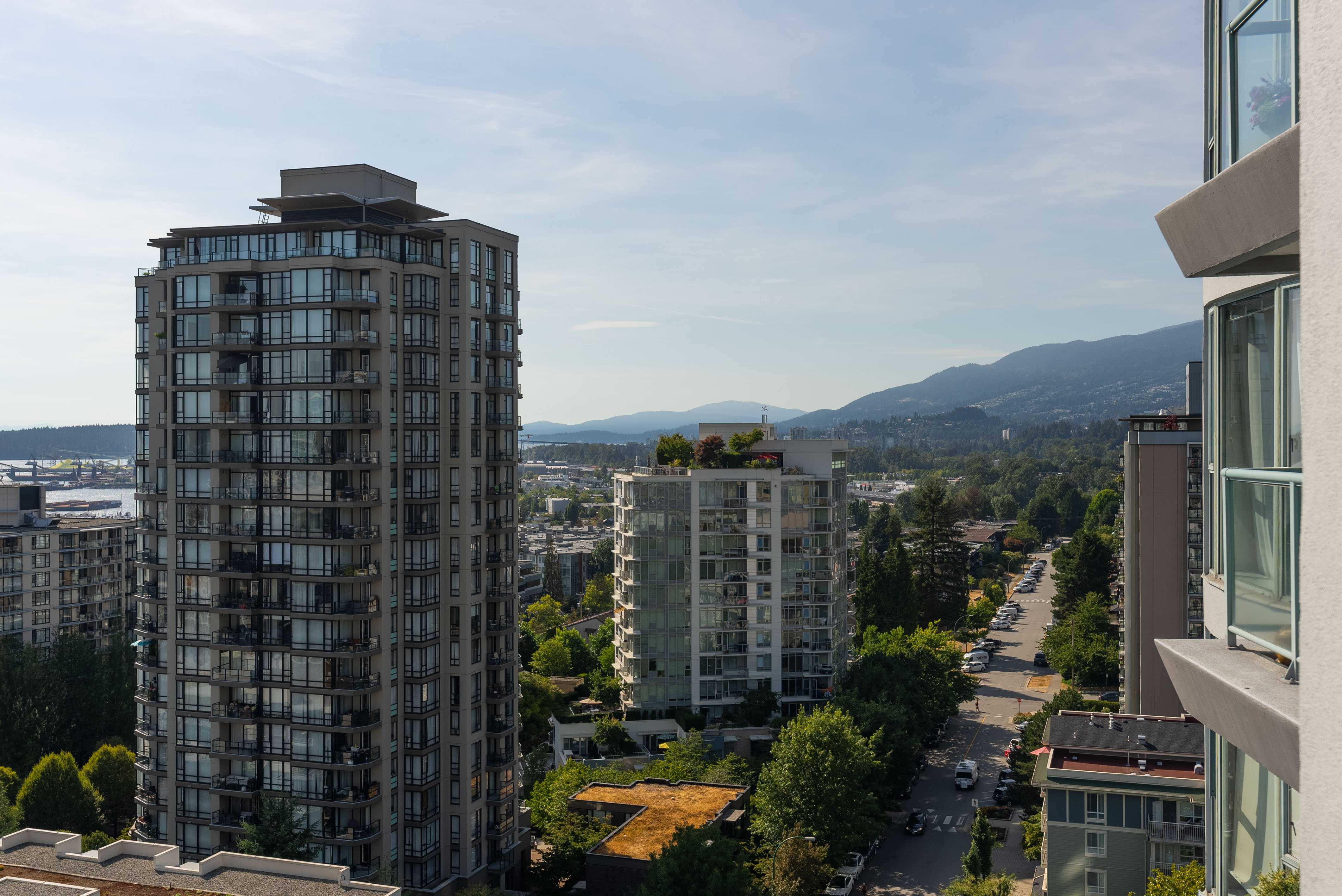 Unobstructed panoramic city & water views from way up on high! The 15th floor sees over local buildings! Views of Van City skyline, Burrard Inlet, Lions Gate Bridge, Mt. Baker, Metrotown/Burnaby Skyline and the North Shore Mountains. Sleek tiled entry, floor to ceiling windows and mesh/blackout blinds compliment the modern/renovated open concept floor plan. Updated kitchen boasts stainless steel appliances, granite tops. Both bathrooms updated with marble or granite themes. Solid dark flooring throughout. Bedrooms on opposite sides of home for privacy. Great closet space. Insuite laundry/built in vac. Plenty of storage.*Enjoy the outdoor pool, exercise centre. 2 underground parking spots. 1 storage locker. Walk to the Seabus. Absolute prime LOLO location; restaurants, cafes, shopping, Lonsdale Quay!
