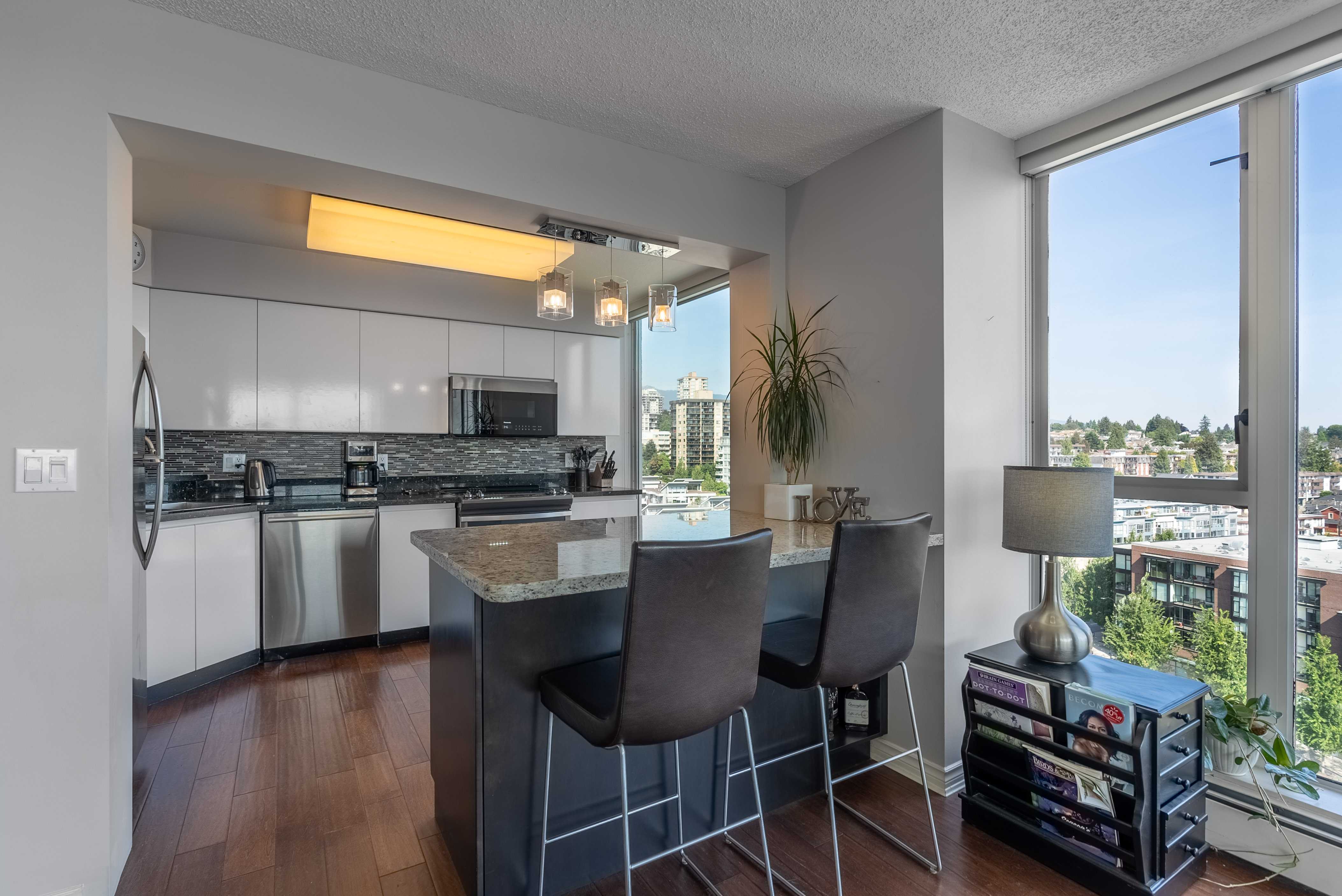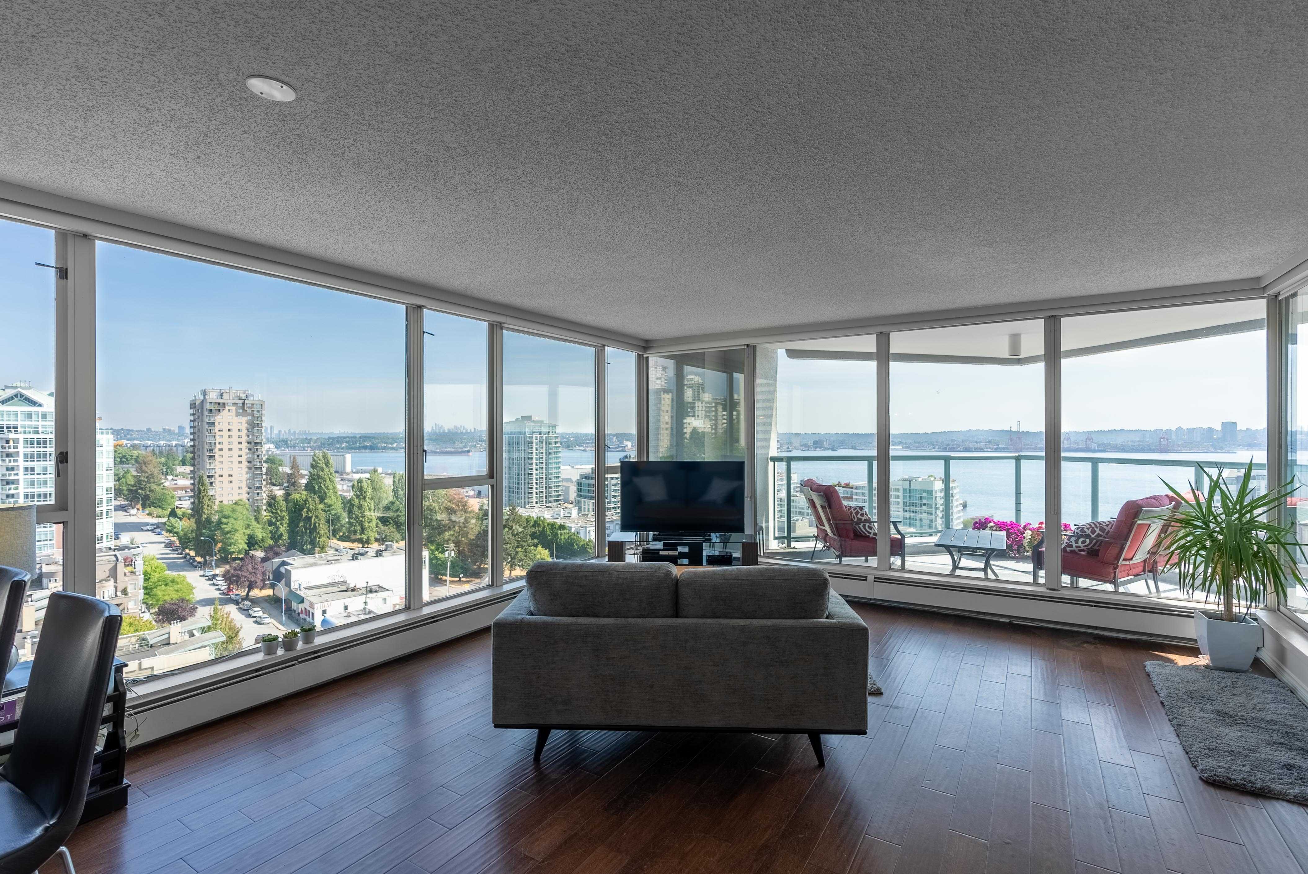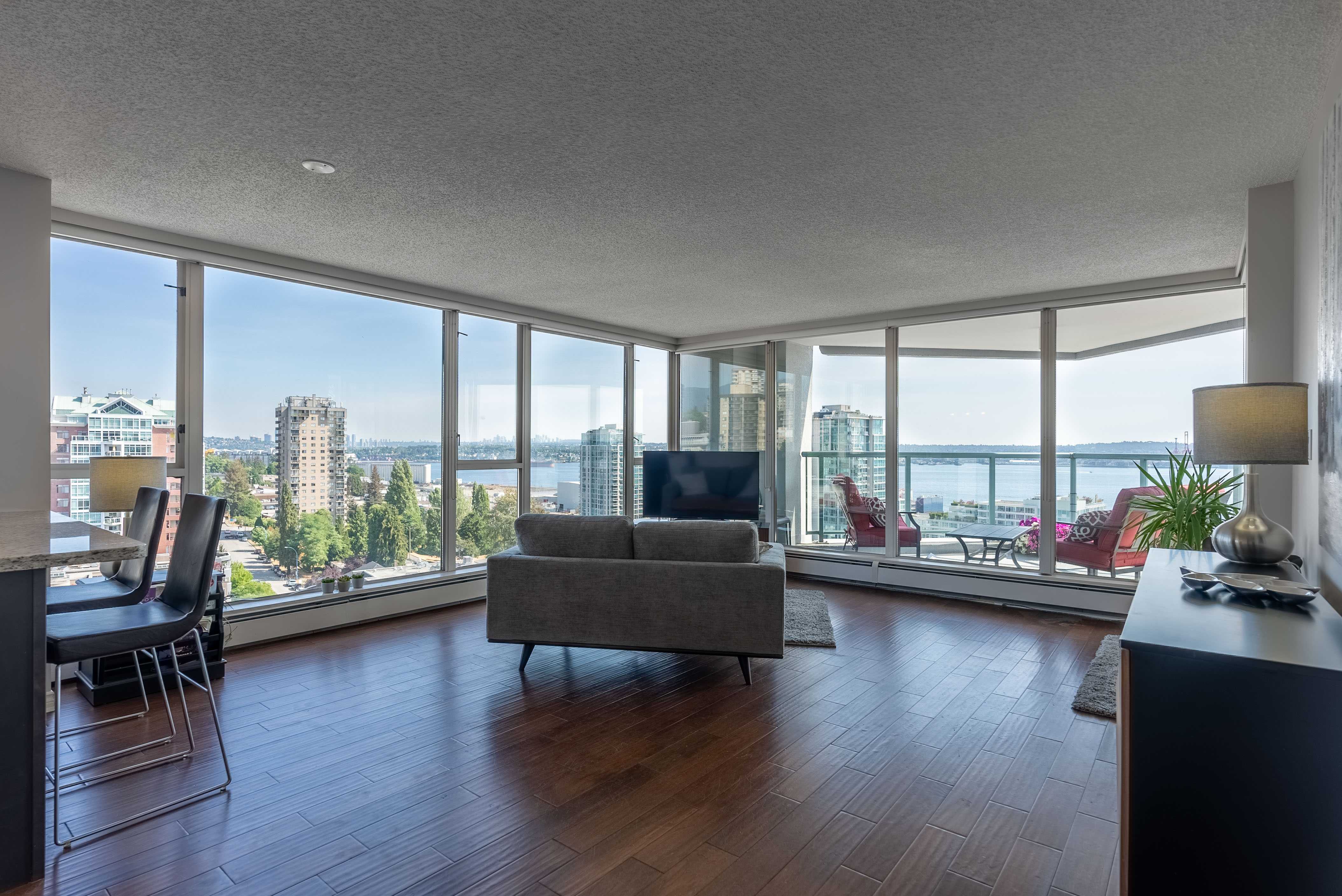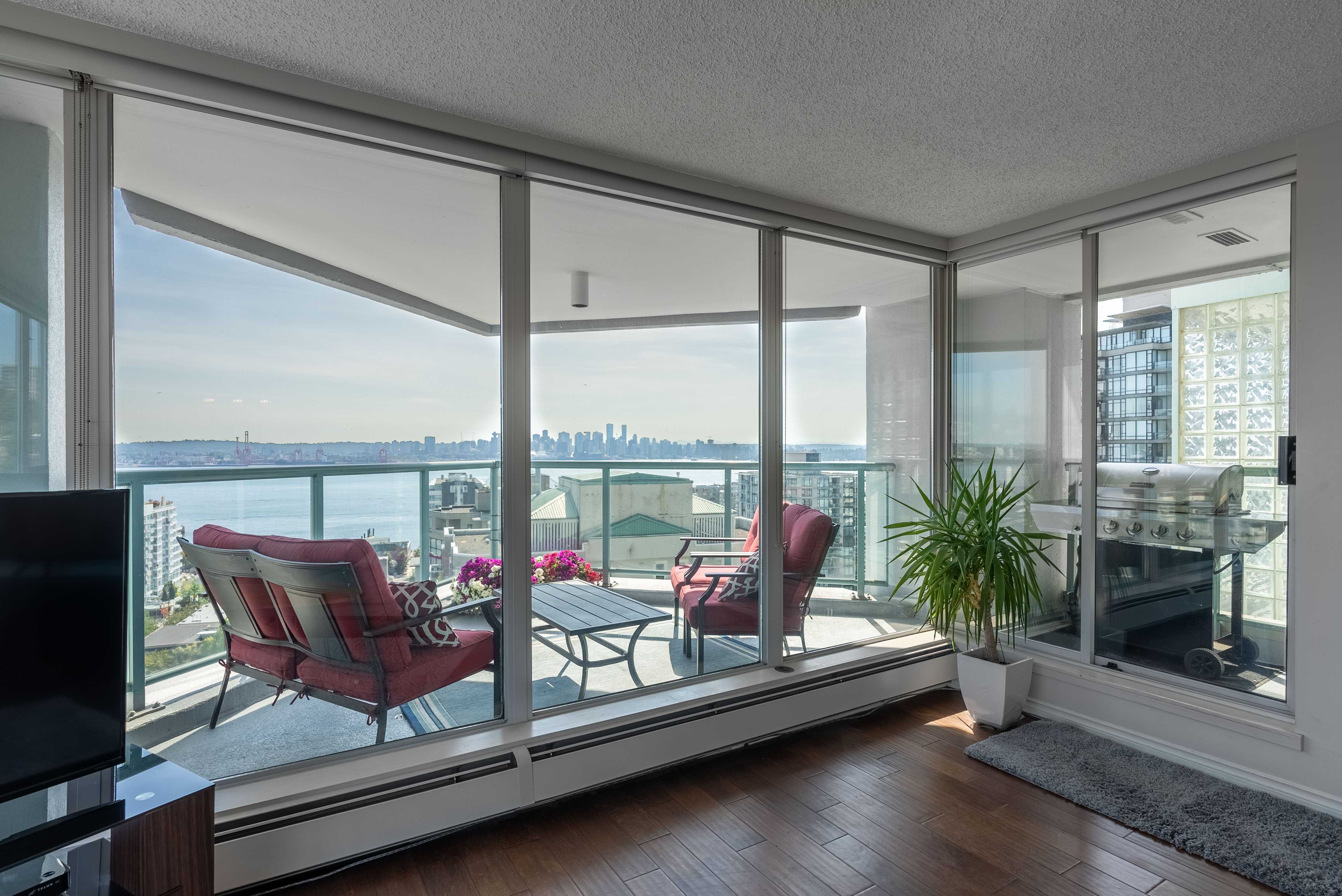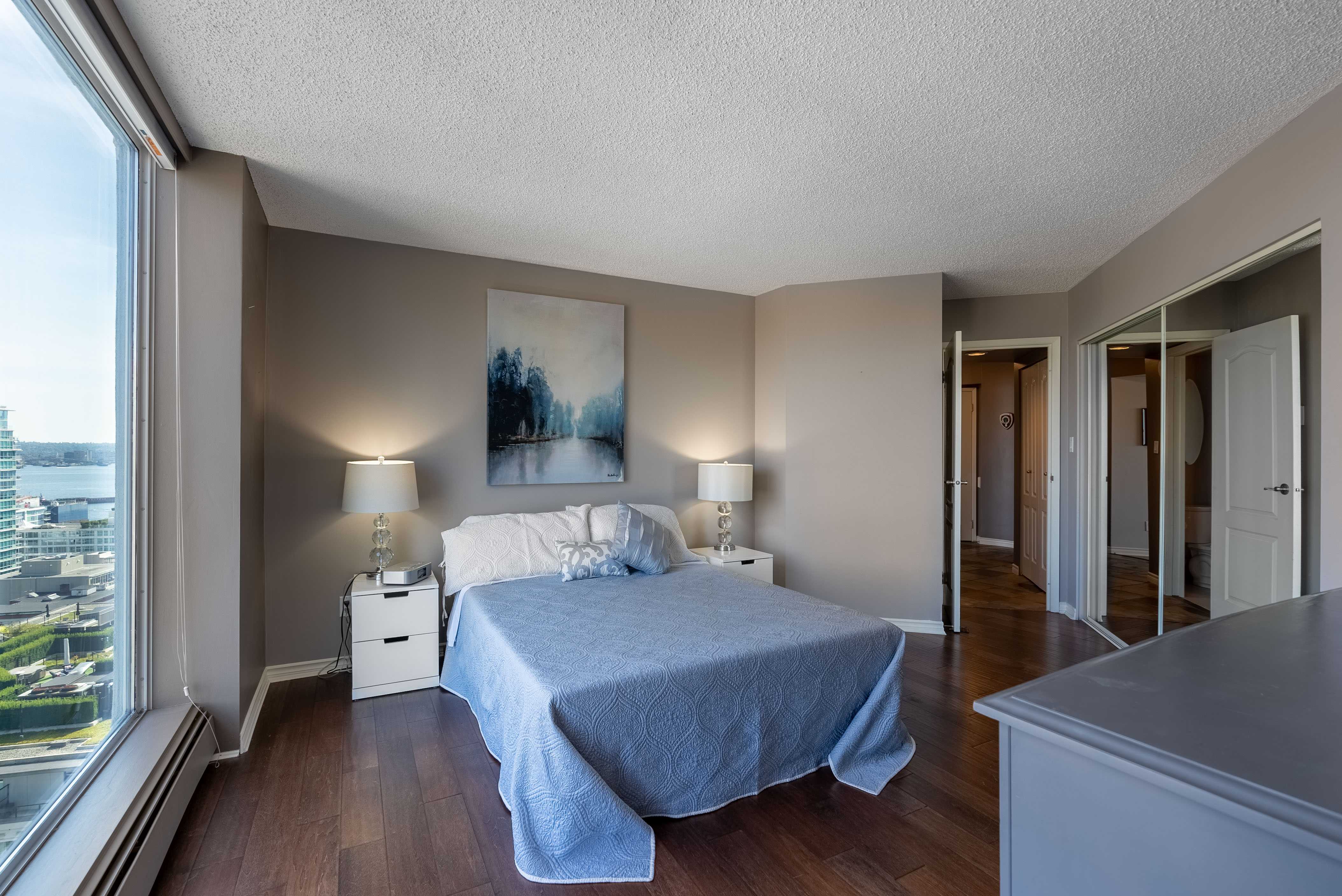 Unobstructed panoramic city & water views from way up on high! The 15th floor sees over local buildings! Views of Van City skyline, Burrard Inlet, Lions Gate Bridge, Mt. Baker, Metrotown/Burnaby Skyline and the North Shore Mountains. Sleek tiled entry, floor to ceiling windows and mesh/blackout blinds compliment the modern/renovated open concept floor plan. Updated kitchen boasts stainless steel appliances, granite tops. Both bathrooms updated with marble or granite themes. Solid dark flooring throughout. Bedrooms on opposite sides of home for privacy. Great closet space. Insuite laundry/built in vac. Plenty of storage.*Enjoy the outdoor pool, exercise centre. 2 underground parking spots. 1 storage locker. Walk to the Seabus. Absolute prime LOLO location; restaurants, cafes, shopping, Lonsdale Quay!