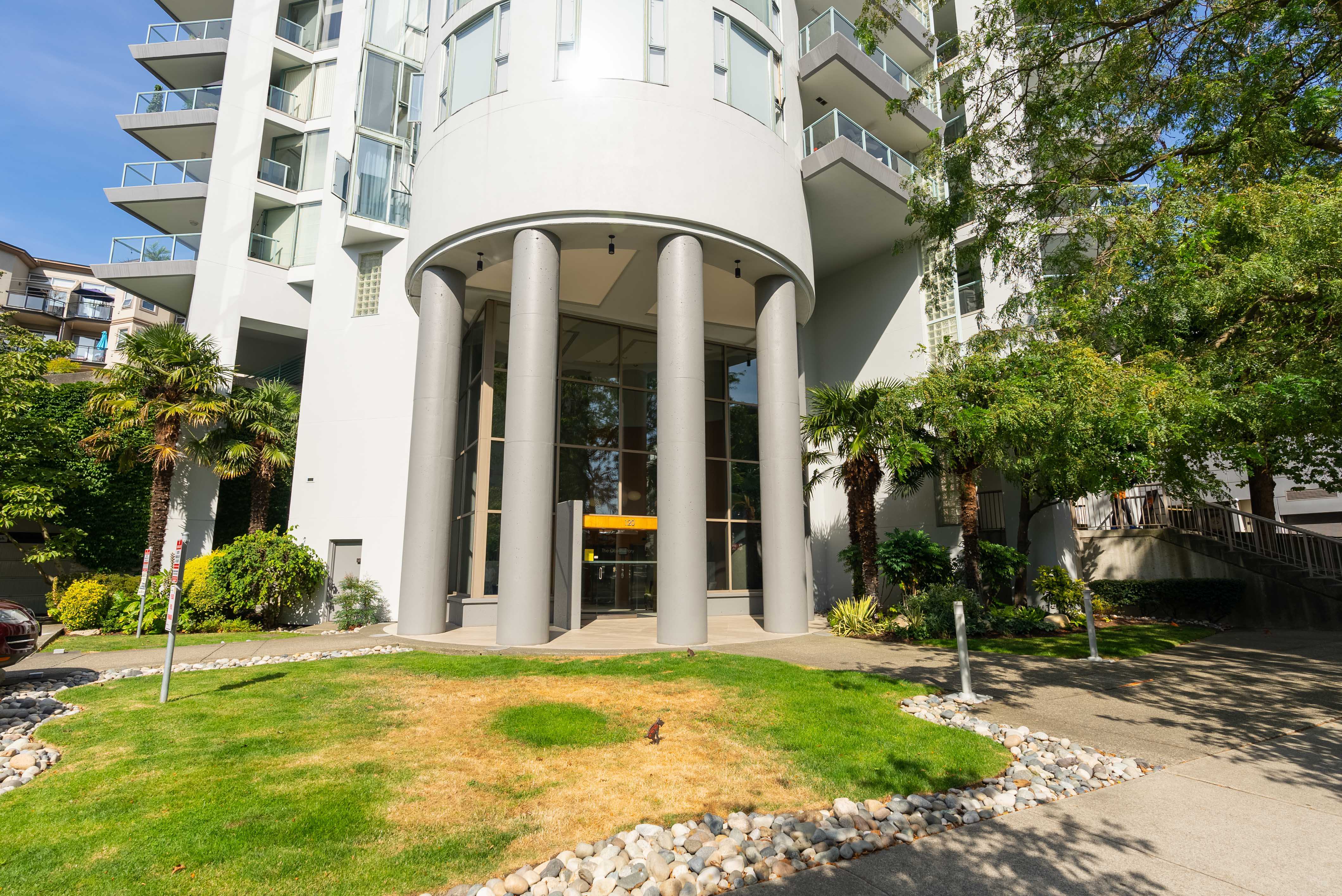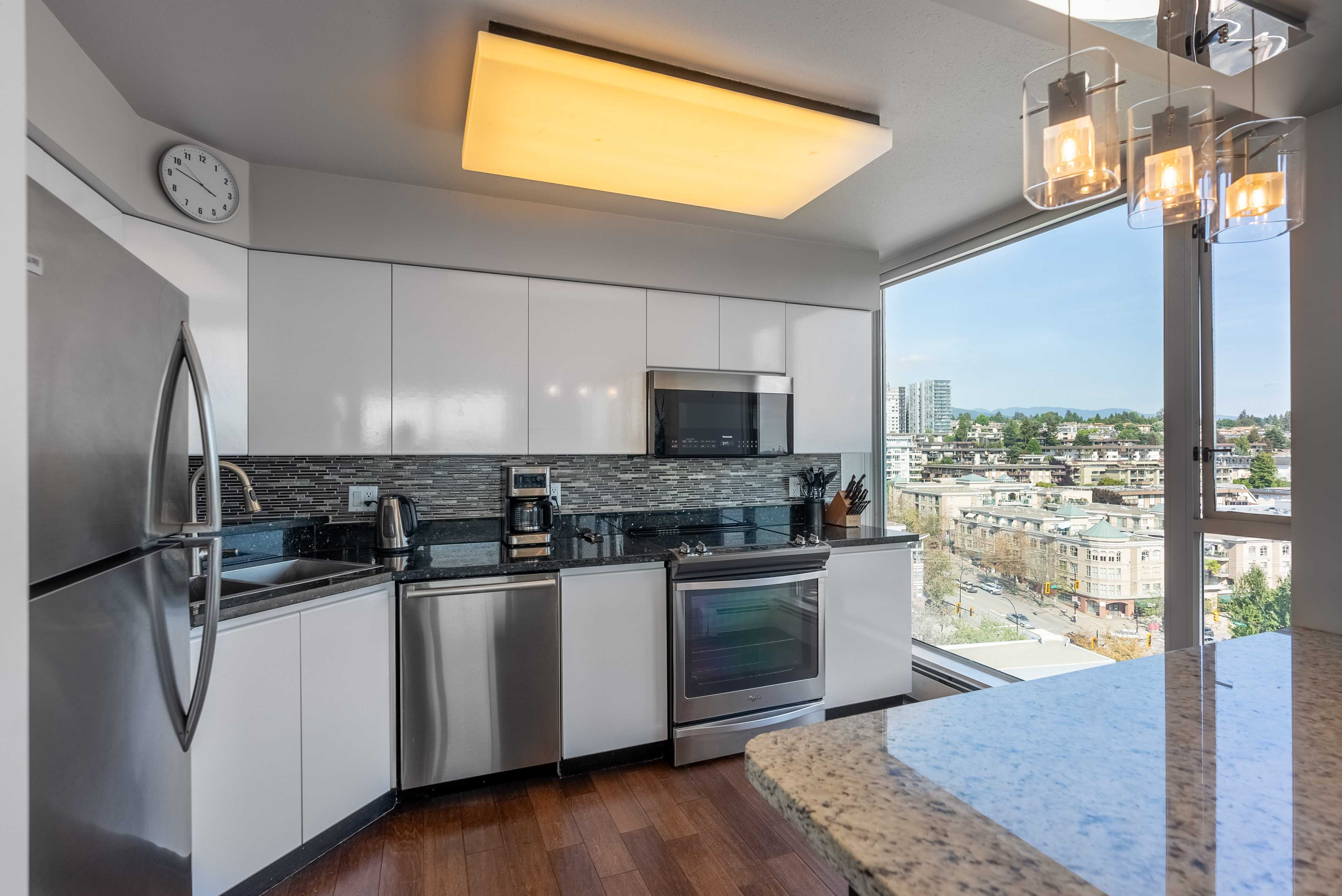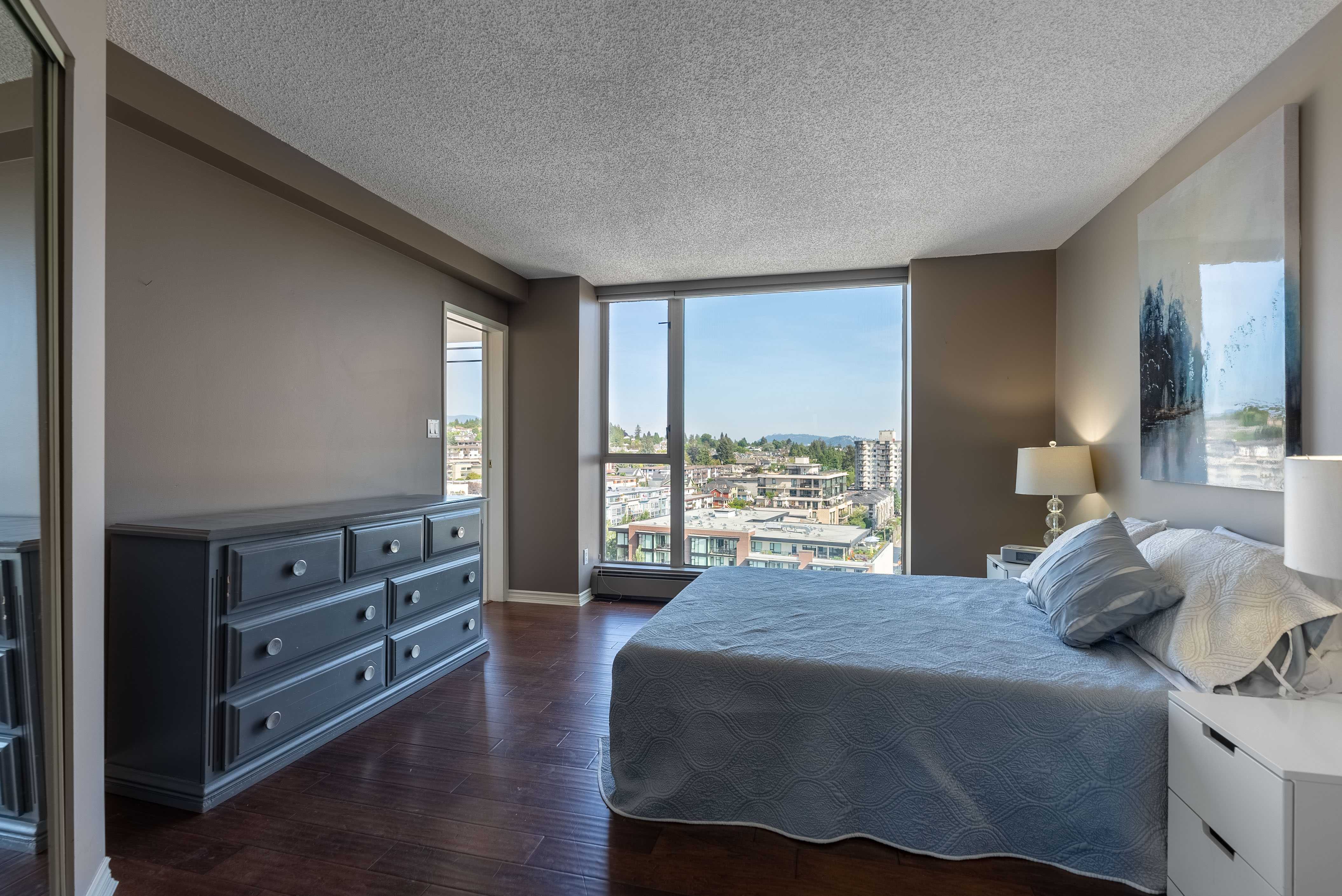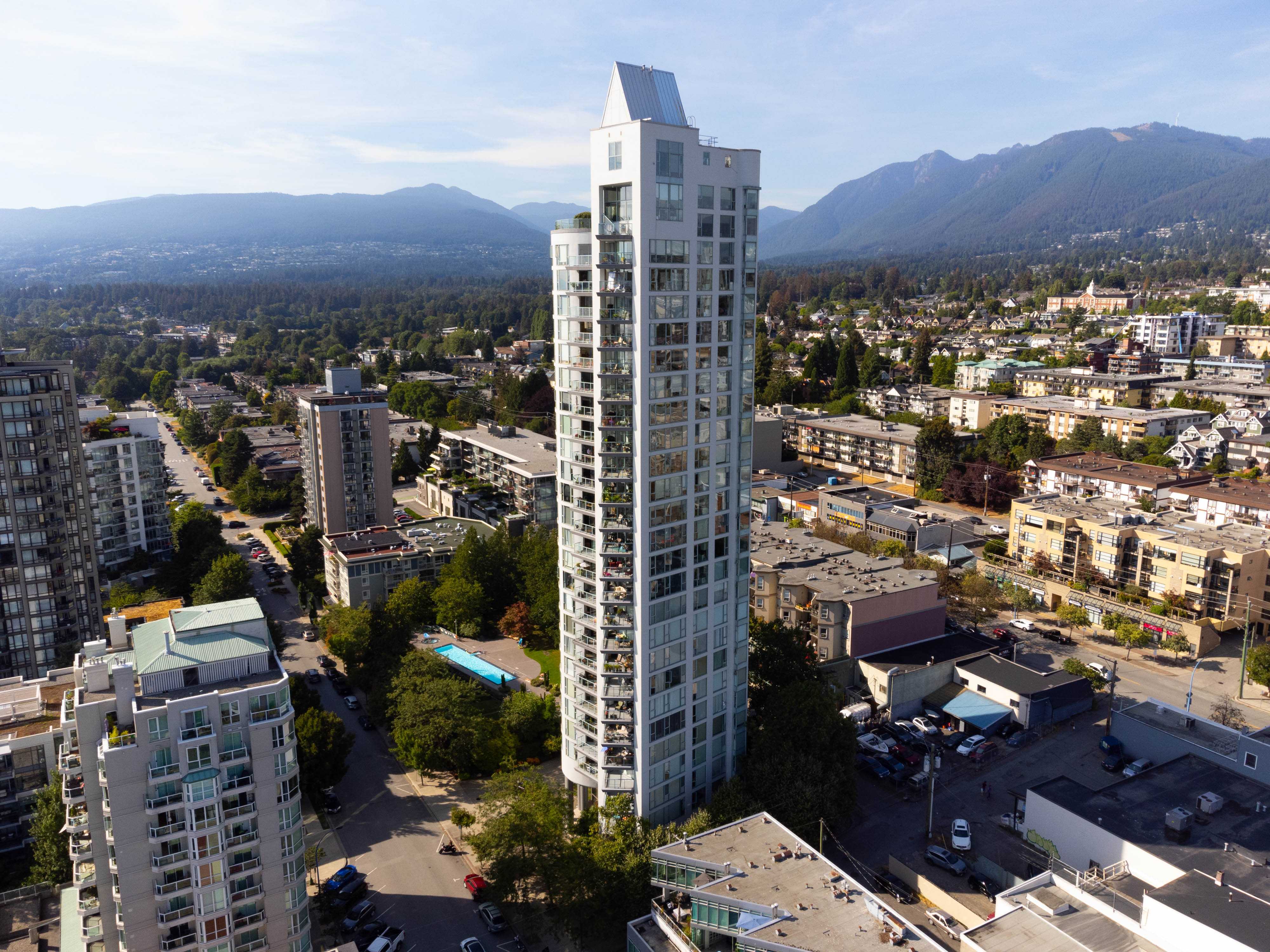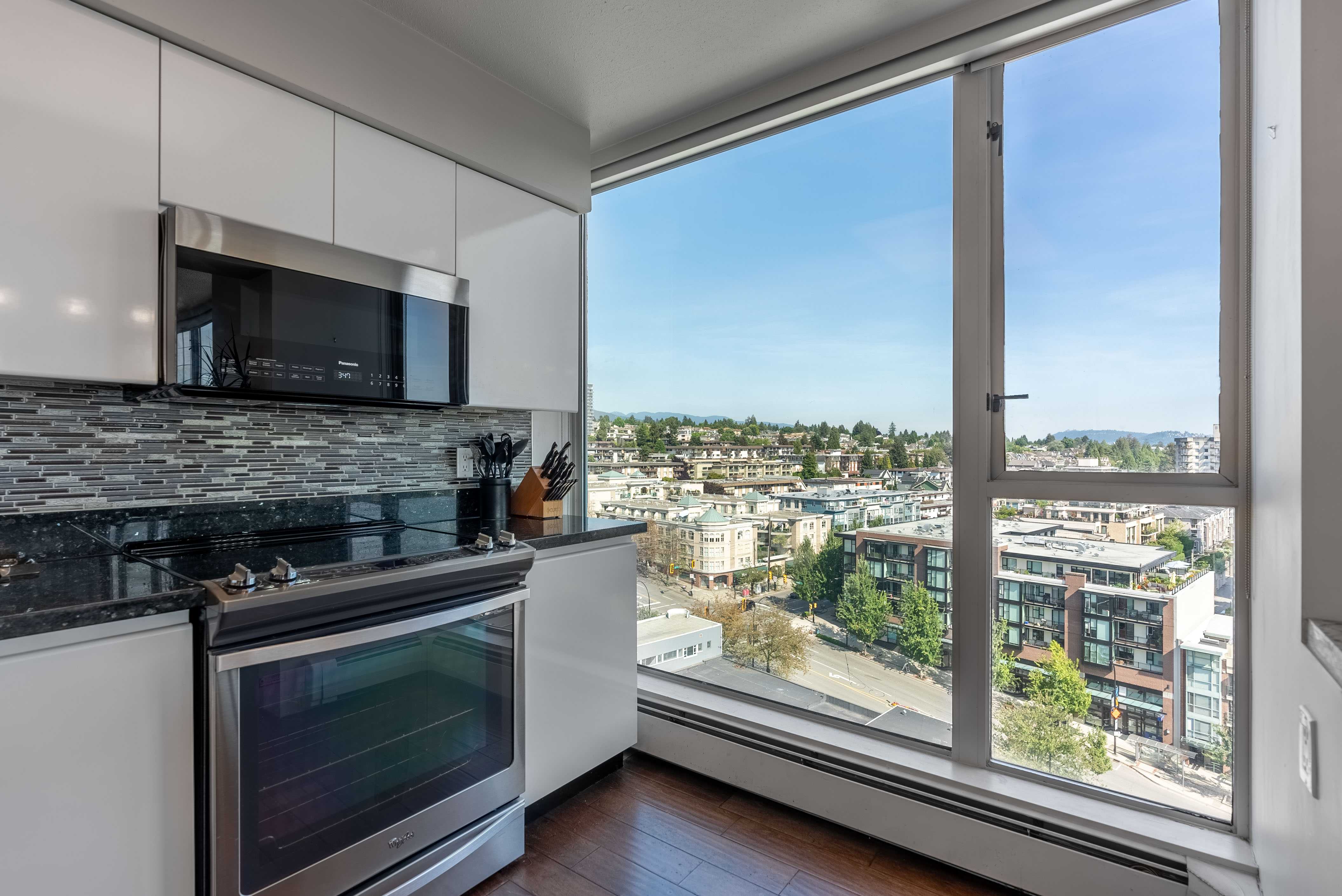 Unobstructed panoramic city & water views from way up on high! The 15th floor sees over local buildings! Views of Van City skyline, Burrard Inlet, Lions Gate Bridge, Mt. Baker, Metrotown/Burnaby Skyline and the North Shore Mountains. Sleek tiled entry, floor to ceiling windows and mesh/blackout blinds compliment the modern/renovated open concept floor plan. Updated kitchen boasts stainless steel appliances, granite tops. Both bathrooms updated with marble or granite themes. Solid dark flooring throughout. Bedrooms on opposite sides of home for privacy. Great closet space. Insuite laundry/built in vac. Plenty of storage.*Enjoy the outdoor pool, exercise centre. 2 underground parking spots. 1 storage locker. Walk to the Seabus. Absolute prime LOLO location; restaurants, cafes, shopping, Lonsdale Quay!