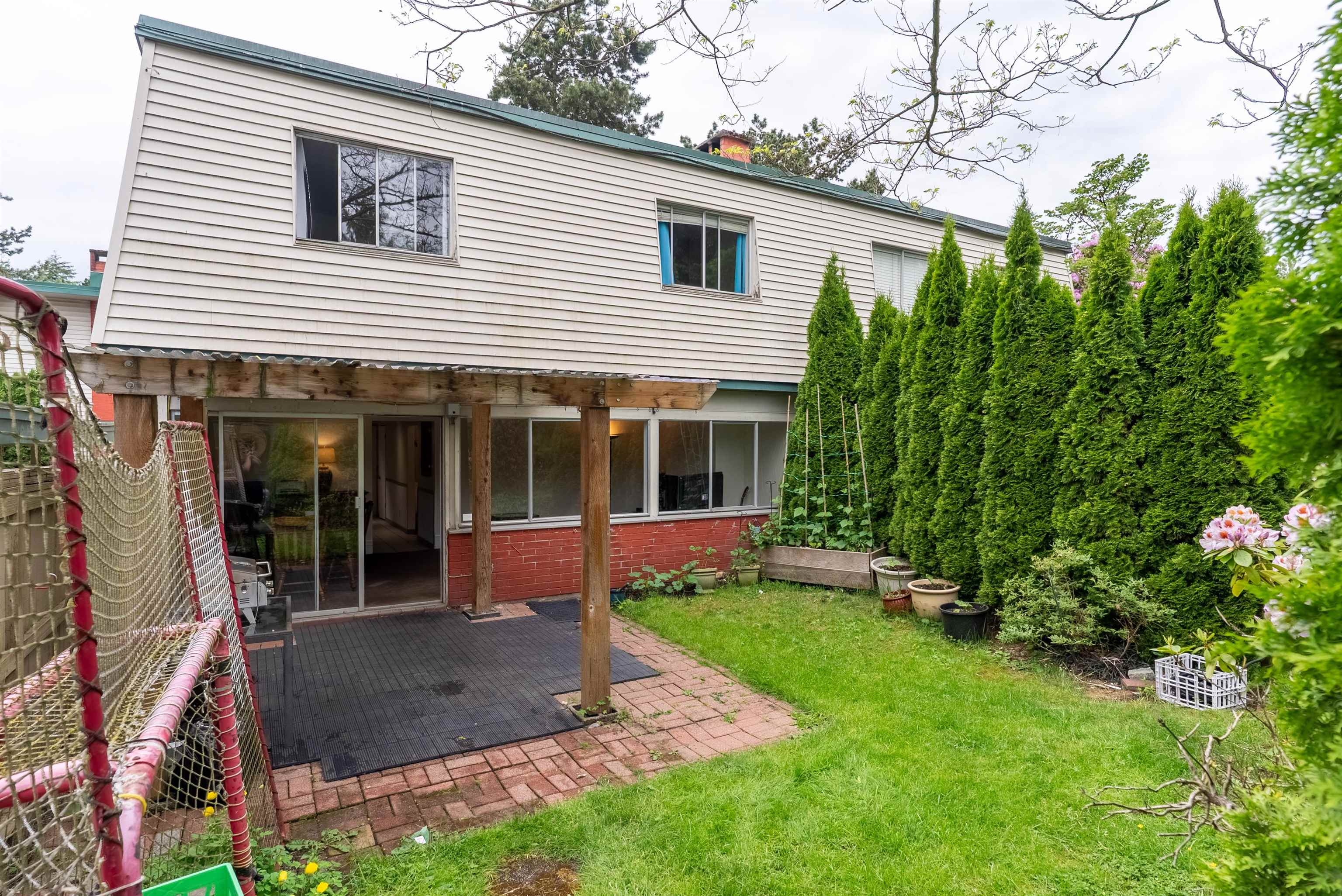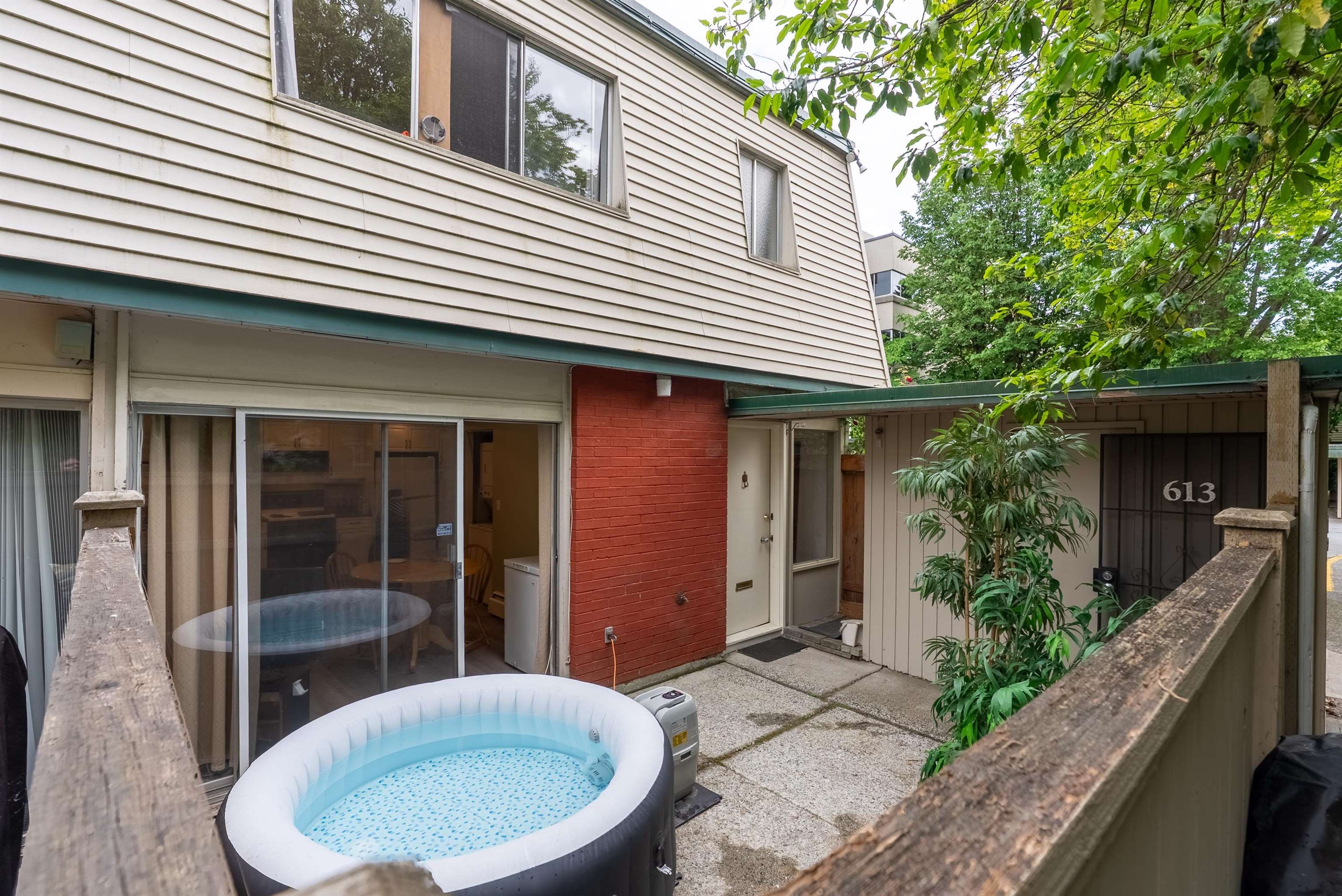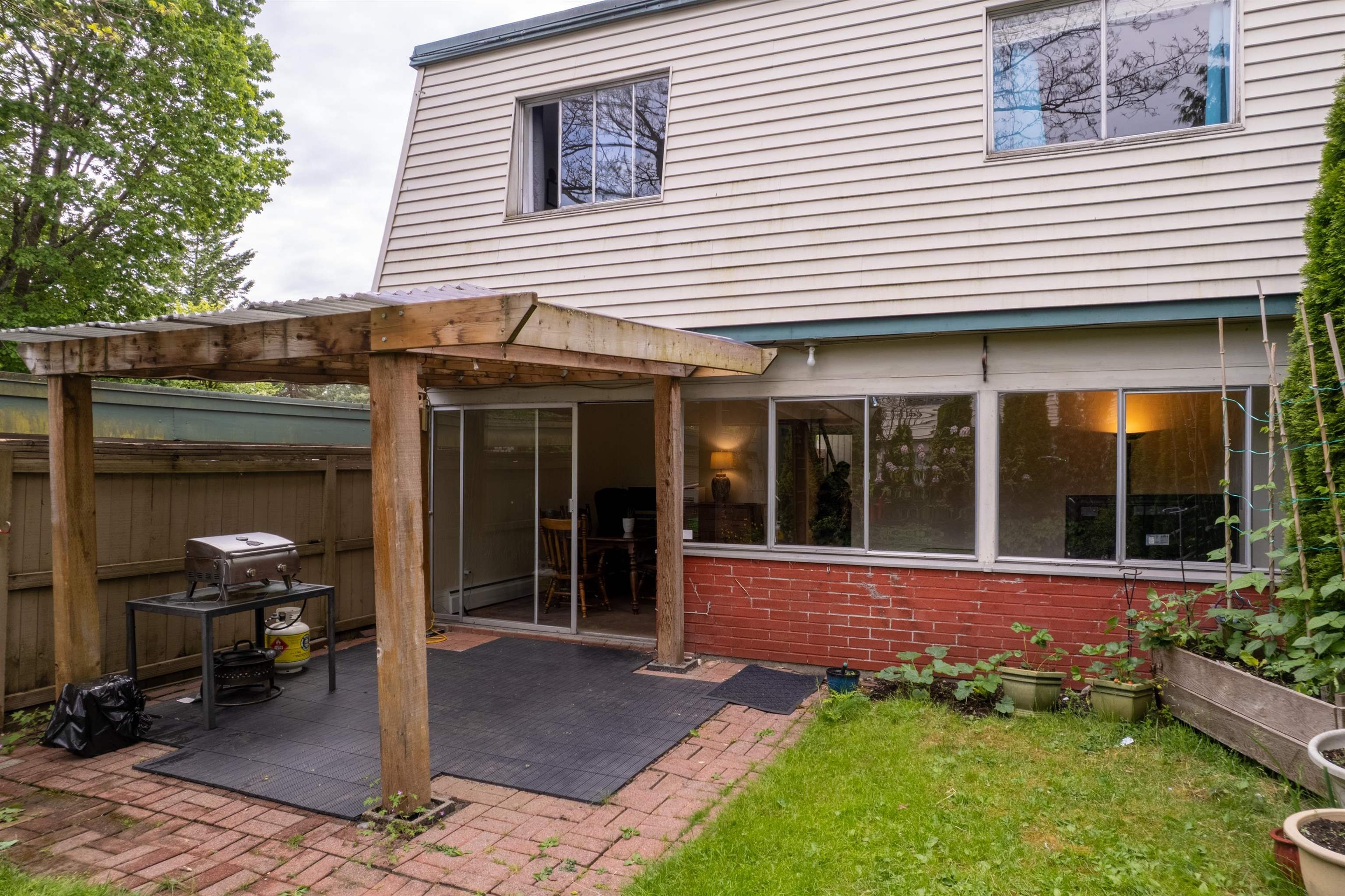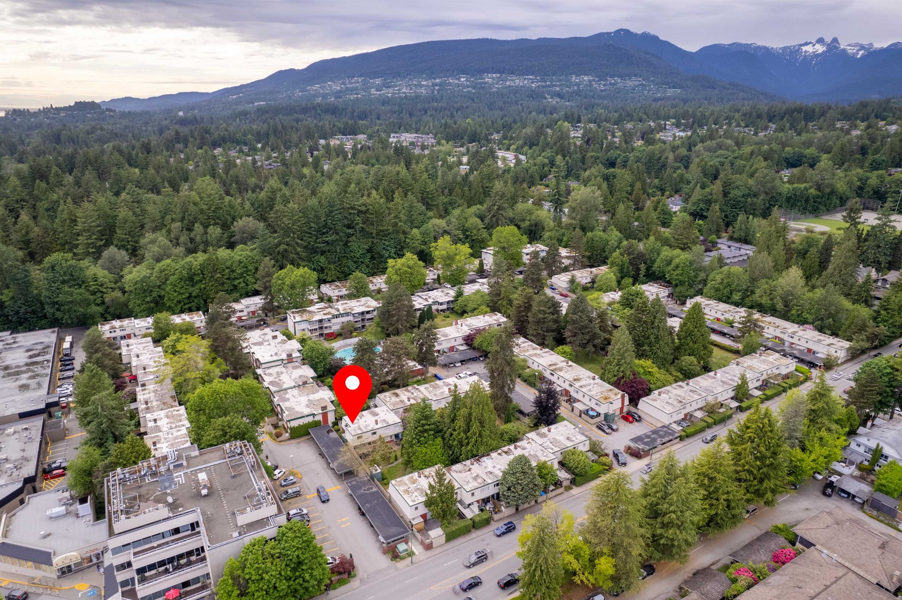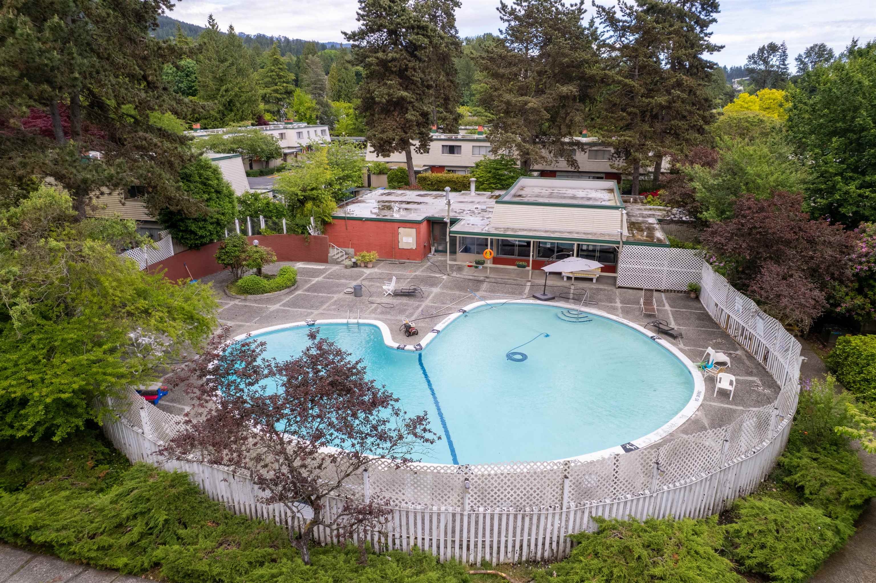 One of the largest CORNER units in the complex. Spacious 3 bed, 3 bath, 2-level townhome with 2 large private patios in a quiet, green setting. Huge, bright rooms and an open concept layout with a large kitchen offer endless potential to make it your own. Generous living/dining area with cozy fireplace. Primary bedroom features full ensuite. Two well-sized bedrooms, in-suite laundry, ample storage, 1 covered parking, and access to an outdoor pool. This well-located complex sits on a massive piece of land with exciting FUTURE REDEVELOPMENT POTENTIAL. Walk to Westview Centre, Delbrook Rec & Edgemont Village. Monthly fee includes HEAT/HOT WATER/PROPERTY TAX! Rentals and pets allowed. Quick possession is possible! Easy to show.